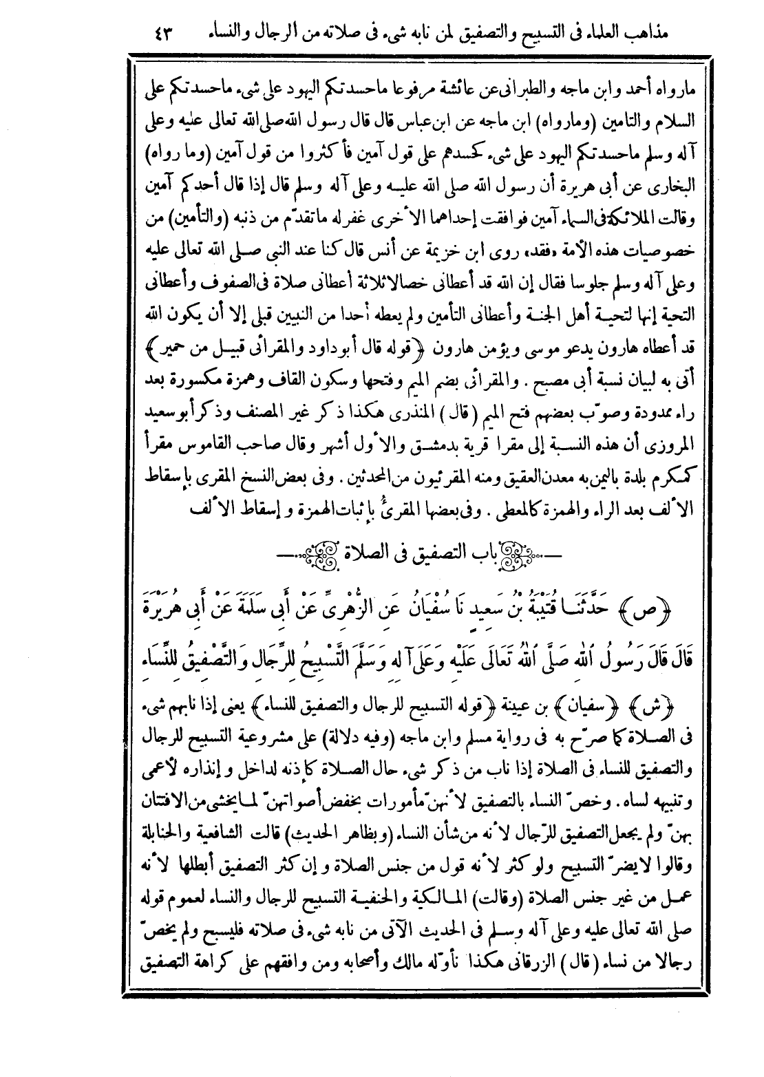 (ص) حَدَّثَنَا قُتَيْبَةُ بْنُ سَعِيدٍ نَا سُفْيَانُ عَنِ الزُّهْرِيِّ عَنْ أَبِي سَلَمَةَ عَنْ أَبِي هُرَيْرَةَ قَالَ قَالَ رَسُولُ اللهِ -صلى الله عليه وسلم- "التَّسْبِيحُ لِلرِّجَالِ وَالتَّصْفِيقُ لِلنِّسَاءِ".