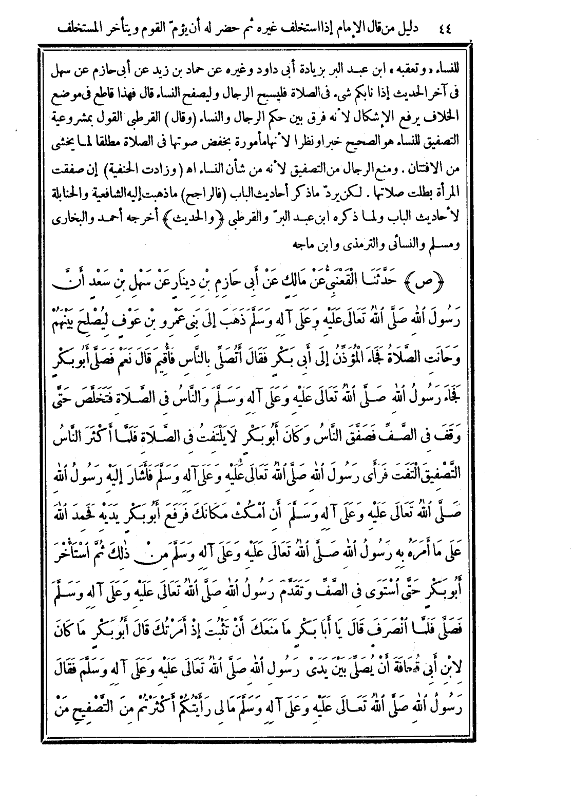 (ص) حَدَّثَنَا الْقَعْنَبِيُّ عَنْ مَالِكٍ عَنْ أَبِي حَازِمِ بْنِ دِينَارٍ عَنْ سَهْلِ بْنِ سَعْدٍ أَنَّ رَسُولَ اللهِ -صلى الله عليه وسلم- ذَهَبَ إِلَى بَنِي عَمْرِو بْنِ عَوْفٍ لِيُصْلِحَ بَيْنَهُمْ وَحَانَتِ الصَّلاَةُ فَجَاءَ الْمُؤَذِّنُ إِلَى أَبِي بَكْرٍ -رضي الله عنه- فَقَالَ أَتُصَلِّي بِالنَّاسِ فَأُقِيمَ قَالَ نَعَمْ. فَصَلَّى أَبُو بَكْرٍ فَجَاءَ رَسُولُ اللهِ -صلى الله عليه وسلم- وَالنَّاسُ في الصَّلاَةِ فَتَخَلَّصَ حَتَّى وَقَفَ في الصَّفِّ فَصَفَّقَ النَّاسُ وَكَانَ أَبُو بَكْرٍ لاَ يَلْتَفِتُ في الصَّلاَةِ فَلَمَّا أَكْثَرَ النَّاسُ التَّصْفِيقَ الْتَفَتَ فَرَأَى رَسُولَ اللهِ -صلى الله عليه وسلم- فَأَشَارَ إِلَيْهِ رَسُولُ اللهِ -صلى الله عليه وسلم- أَنِ امْكُثْ مَكَانَكَ فَرَفَعَ أَبُو بَكْرٍ يَدَيْهِ فَحَمِدَ اللهَ عَلَى مَا أَمَرَهُ بِهِ رَسُولُ اللهِ -صلى الله عليه وسلم- مِنْ ذَلِكَ ثُمَّ اسْتَأْخَرَ أَبُو بَكْرٍ حَتَّى اسْتَوَى في الصَّفِّ وَتَقَدَّمَ رَسُولُ اللهِ -صلى الله عليه وسلم- فَصَلَّى فَلَمَّا انْصَرَفَ قَالَ "يَا أَبَا بَكْرٍ مَا مَنَعَكَ أَنْ تَثْبُتَ إِذْ أَمَرْتُكَ". قَالَ أَبُو بَكْرٍ مَا كَانَ لاِبْنِ أَبِي قُحَافَةَ أَنْ يُصَلِّىَ بَيْنَ يَدَىْ رَسُولِ اللهِ -صلى الله عليه وسلم-. فَقَالَ رَسُولُ اللهِ -صلى الله عليه وسلم- "مَا لِي رَأَيْتُكُمْ أَكْثَرْتُمْ مِنَ التَّصْفِيحِ مَنْ
