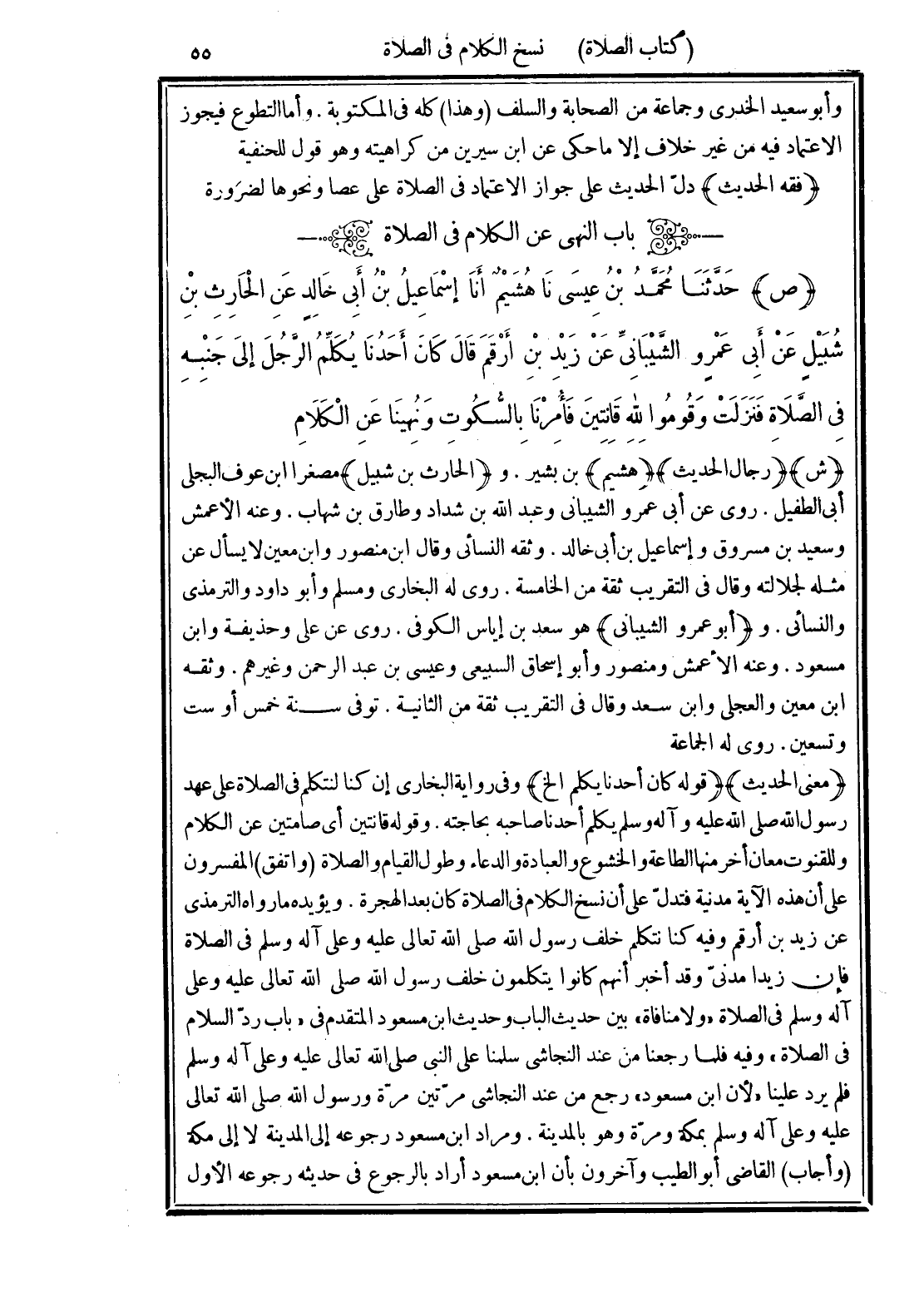 (ص) حَدَّثَنَا مُحَمَّدُ بْنُ عِيسَى نَا هُشَيْمٌ أَنَا إِسْمَاعِيلُ بْنُ أَبِي خَالِدٍ عَنِ الْحَارِثِ بْنِ شُبَيْلٍ عَنْ أَبِي عَمْرٍو الشَّيْبَانِيِّ عَنْ زَيْدِ بْنِ أَرْقَمَ قَالَ كَانَ أَحَدُنَا يُكَلِّمُ الرَّجُلَ إِلَى جَنْبِهِ فِى الصَّلاَةِ فَنَزَلَتْ {وَقُومُوا لِلَّهِ قَانِتِينَ} فَأُمِرْنَا بِالسُّكُوتِ وَنُهِينَا عَنِ الْكَلاَمِ.