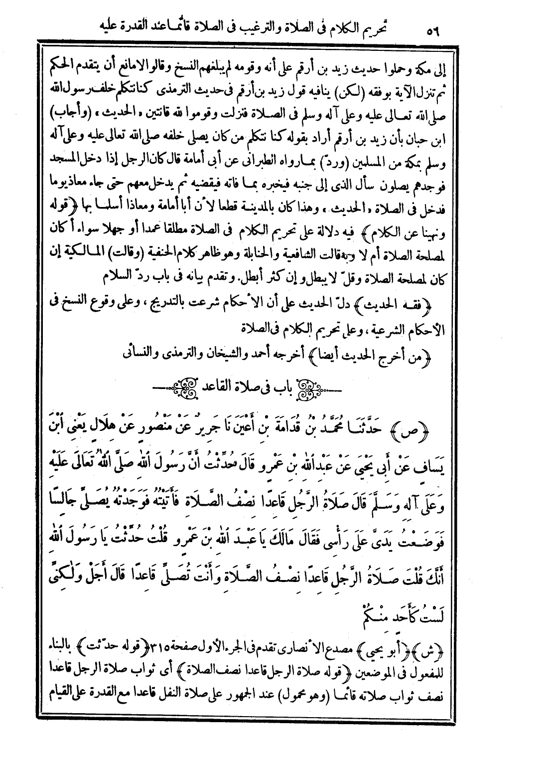 (قوله ونهينا عن الكلام) فيه دلالة على تحريم الكلام في الصلاة مطلقًا عمدًا أوجهلًا سواء أكان لمصلحة الصلاة أم لا وبه قالت الشافعية والحنابلة وهو ظاهر كلام الحنفية (وقالت) المالكية إن كان لمصلحة الصلاة وقلّ لا يبطل وإن كثر أبطل. وتقدم بيانه في باب ردّ السلام