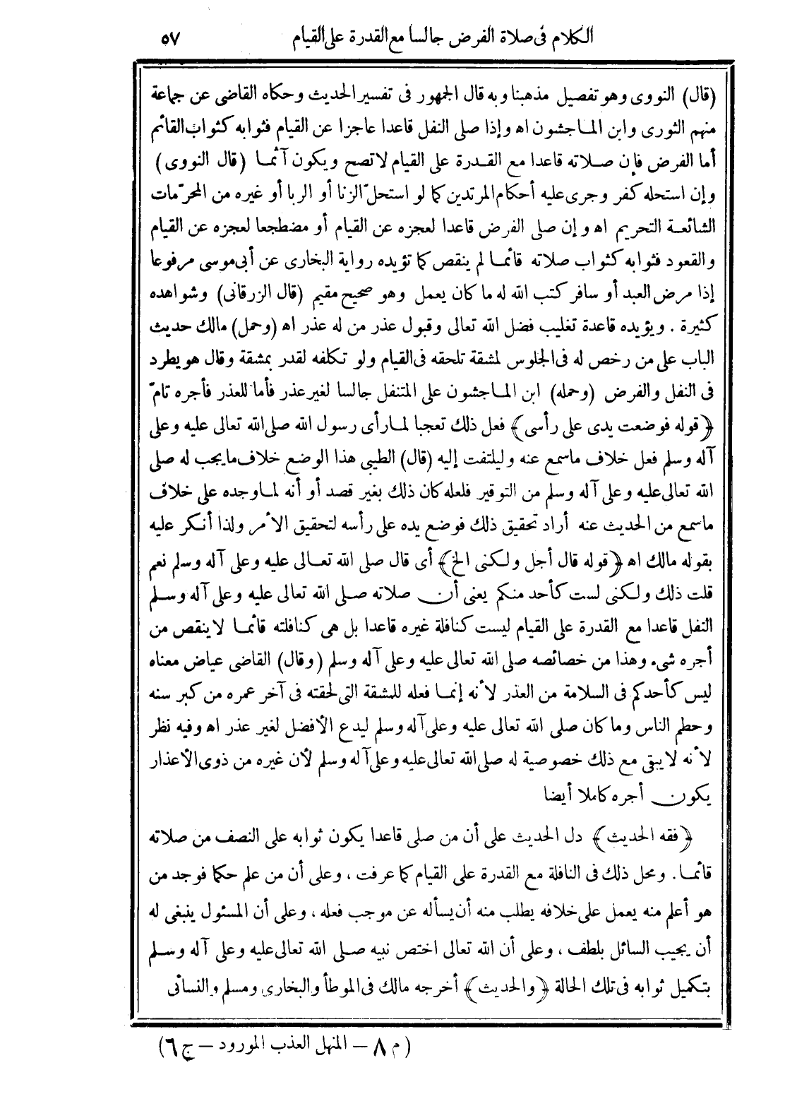 (فقه الحديث) دل الحديث على أن من صلى قاعدًا يكون ثوابه على النصف من صلاته قائمًا. ومحل ذلك في النافلة مع القدرة على القيام كما عرفت، وعلى أن من علم حكمًا فوجد من هو أعلم منه يعمل على خلافه يطلب منه أن يسأله عن موجب فعله، وعلى أن المسئول ينبغي له أن يجيب السائل بلطف، وعلى أن الله تعالى اختص نبيه صلى الله تعالى عليه وعلى آله وسلم بتكميل ثوابه في تلك الحالة
