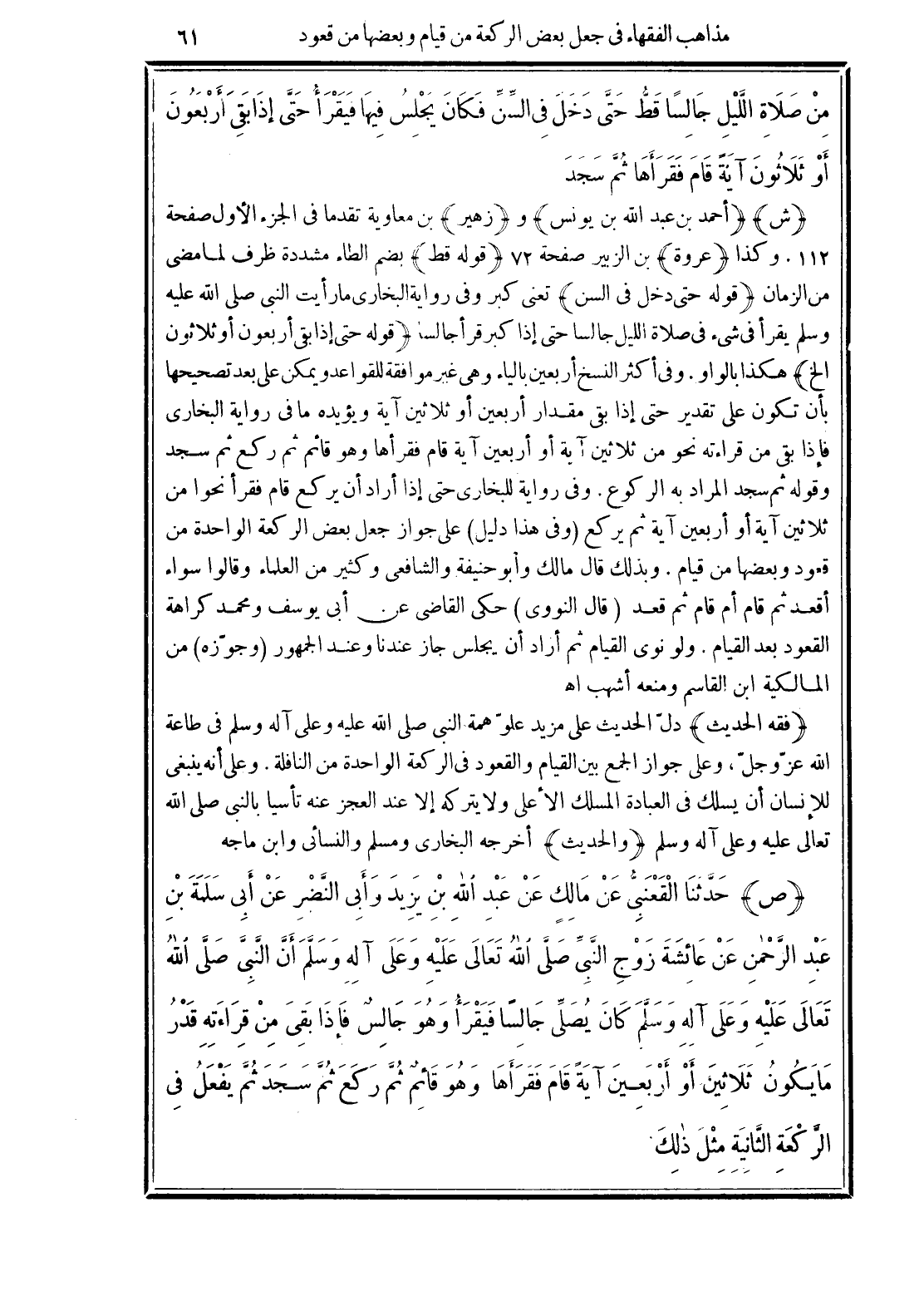 (فقه الحديث) دلّ الحديث على مزيد علوّ همة النبي صلى الله عليه وعلى آله وسلم في طاعة الله عَزَّ وَجَلَّ، وعلى جواز الجمع بين القيام والقعود في الركعة الواحدة من النافلة. وعلى أنه ينبغي للإنسان أن يسلك في العبادة المسلك الأعلى ولا يتركه إلا عند العجز عنه تأسيًا بالنبي صلى الله تعالى عليه وعلى آله وسلم