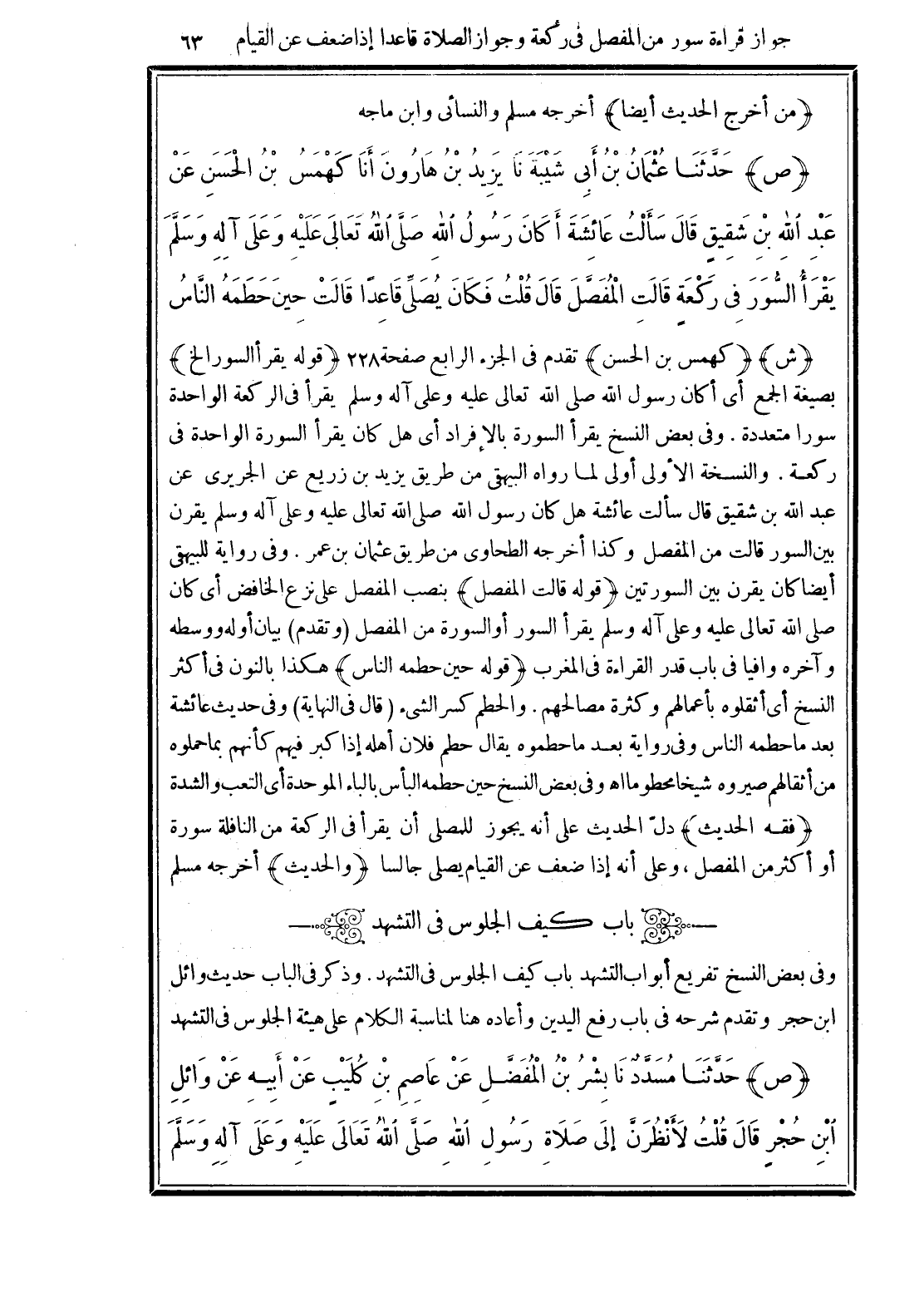 (ص) حَدَّثَنَا عُثْمَانُ بْنُ أَبِي شَيْبَةَ نَا يَزِيدُ بْنُ هَارُونَ نَا كَهْمَسُ بْنُ الْحَسَنِ عَنْ عَبْدِ اللَّهِ بْنِ شَقِيقٍ قَالَ سَأَلْتُ عَائِشَةَ أَكَانَ رَسُولُ اللَّهِ -صلى الله عليه وسلم- يَقْرَأُ السُّورَةَ فِى رَكْعَةٍ قَالَتِ الْمُفَصَّلَ. قَالَ قُلْتُ فَكَانَ يُصَلِّي قَاعِدًا قَالَتْ حِينَ حَطَمَهُ النَّاسُ.