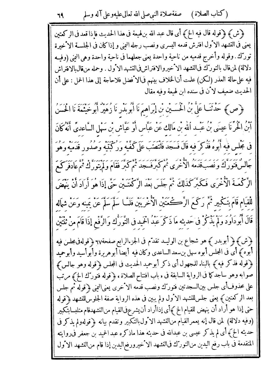 (ص) حَدَّثَنَا عَلِيُّ بْنُ الْحُسَيْنِ بْنِ إِبْرَاهِيمَ نَا أَبُو بَدْرٍ نَا زُهَيْرٌ أَبُو خَيْثَمَةَ نَا الْحَسَنُ بْنُ الْحُرِّ نَا عِيسَى بْنُ عَبْدِ اللَّهِ بْنِ مَالِكٍ عَنْ عَبَّاسِ -أَوْ عَيَّاشِ- بْنِ سَهْلٍ السَّاعِدِيِّ أَنَّهُ كَانَ فِى مَجْلِسٍ فِيهِ أَبُوهُ فَذُكِرَ فِيهِ قَالَ فَسَجَدَ فَانْتَصَبَ عَلَى كَفَّيْهِ وَرُكْبَتَيْهِ وَصُدُورِ قَدَمَيْهِ وَهُوَ جَالِسٌ فَتَوَرَّكَ وَنَصَبَ قَدَمَهُ الأُخْرَى ثُمَّ كَبَّرَ فَسَجَدَ ثُمَّ كَبَّرَ فَقَامَ وَلَمْ يَتَوَرَّكْ ثُمَّ عَادَ فَرَكَعَ الرَّكْعَةَ الأُخْرَى فَكَبَّرَ كَذَلِكَ ثُمَّ جَلَسَ بَعْدَ الرَّكْعَتَيْنِ حَتَّى إِذَا هُوَ أَرَادَ أَنْ يَنْهَضَ لِلْقِيَامِ قَامَ بِتَكْبِيرٍ ثُمَّ رَكَعَ الرَّكْعَتَيْنِ الأُخْرَيَيْنِ فَلَمَّا سَلَّمَ سَلَّمَ عَنْ يَمِينِهِ وَعَنْ شِمَالِهِ. قَالَ أَبُو دَاوُدَ لَمْ يَذْكُرْ فِى حَدِيثِهِ مَا ذَكَرَ عَبْدُ الْحَمِيدِ فِى التَّوَرُّكِ وَالرَّفْعِ إِذَا قَامَ مِنْ ثِنْتَيْنِ.