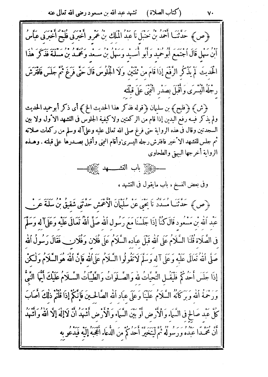 (ص) حَدَّثَنَا أَحْمَدُ بْنُ حَنْبَلٍ نَا عَبْدُ الْمَلِكِ بْنُ عَمْرٍو أَخْبَرَنِي فُلَيْحٌ أَخْبَرَنِي عَبَّاسُ بْنُ سَهْلٍ قَالَ اجْتَمَعَ أَبُو حُمَيْدٍ وَأَبُو أُسَيْدٍ وَسَهْلُ بْنُ سَعْدٍ وَمُحَمَّدُ بْنُ مَسْلَمَةَ فَذَكَرَ هَذَا الْحَدِيثَ وَلَمْ يَذْكُرِ الرَّفْعَ إِذَا قَامَ مِنْ ثِنْتَيْنِ وَلاَ الْجُلُوسَ قَالَ حَتَّى فَرَغَ ثُمَّ جَلَسَ فَافْتَرَشَ رِجْلَهُ الْيُسْرَى وَأَقْبَلَ بِصَدْرِ الْيُمْنَى عَلَى قِبْلَتِهِ.
