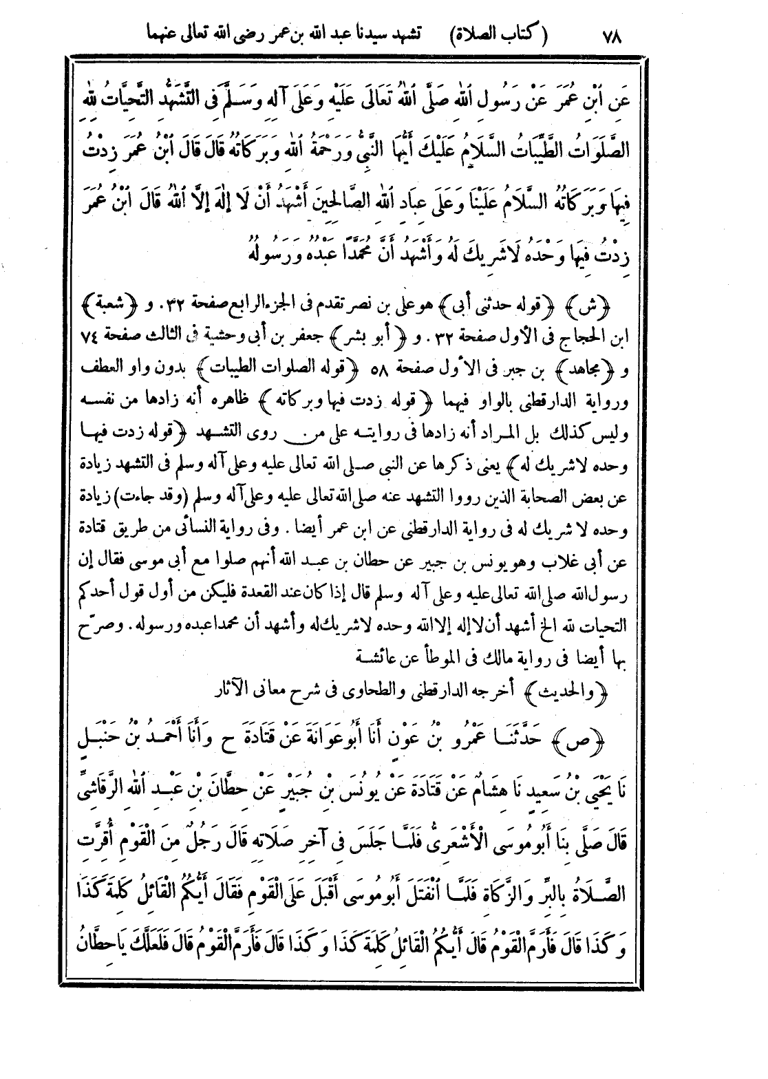 عَنِ ابْنِ عُمَرَ عَنْ رَسُولِ اللهِ صَلَّى الله تَعَالَى عَلَيْهِ وَعَلَى آلِهِ وَسَلَّمَ في التَّشَهُّدِ "التَّحِيَّاتُ لِلَّهِ الصَّلَوَاتُ الطَّيِّبَاتُ السَّلاَمُ عَلَيْكَ أَيُّهَا النَّبِيُّ وَرَحْمَةُ اللهِ وَبَرَكَاتُهُ". قَالَ قَالَ ابْنُ عُمَرَ زِدْتُ فِيهَا وَبَرَكَاتُهُ. "السَّلاَمُ عَلَيْنَا وَعَلَى عِبَادِ اللهِ الصَّالِحِينَ أَشْهَدُ أَنْ لاَ إِلَهَ إِلاَّ الله". قَالَ ابْنُ عُمَرَ زِدْتُ فِيهَا وَحْدَهُ لاَ شَرِيكَ لَهُ. "وَأَشْهَدُ أَنَّ مُحَمَّدًا عَبْدُهُ وَرَسُولُهُ".