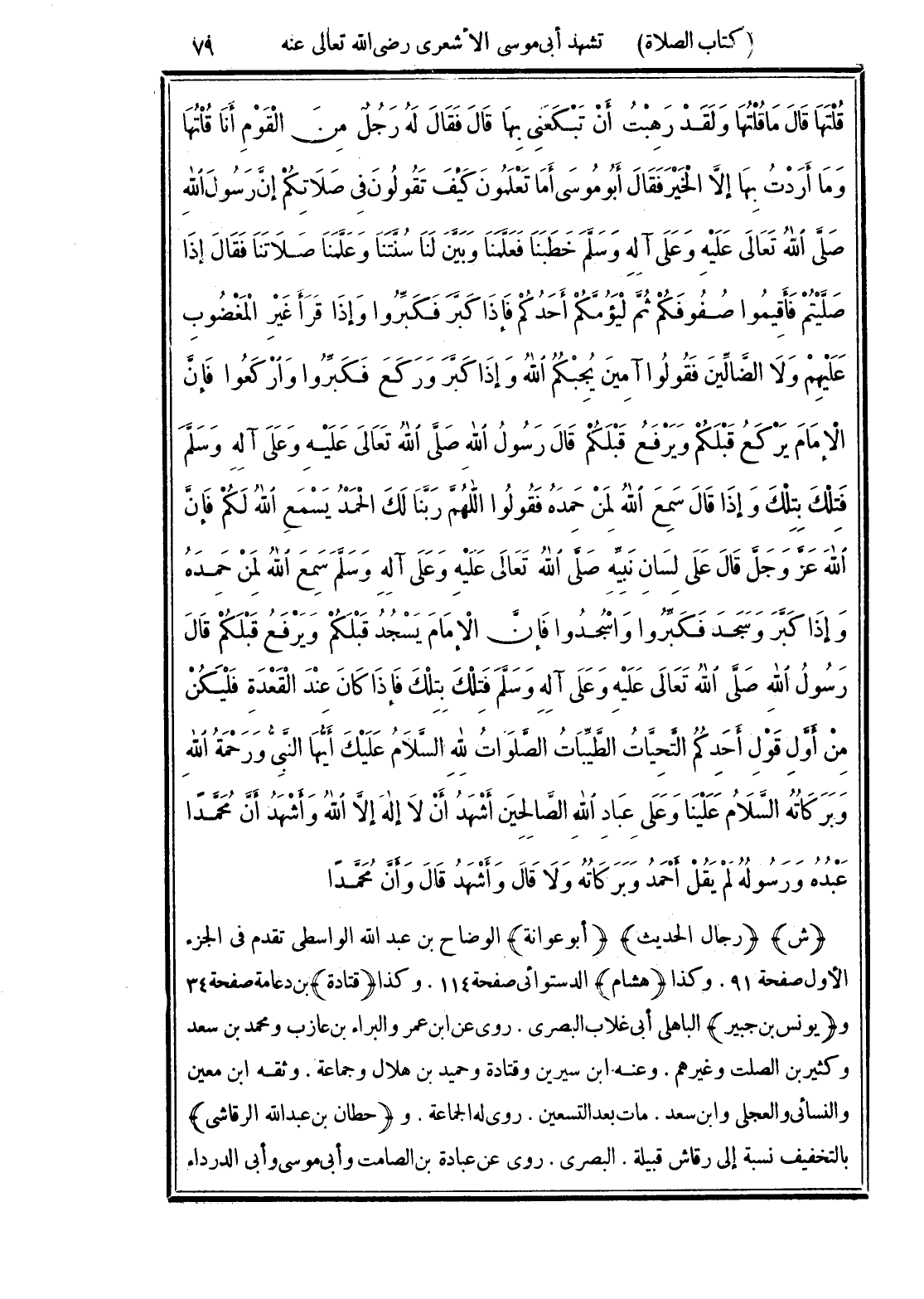 أَنْتَ قُلْتَهَا. قَالَ مَا قُلْتُهَا وَلَقَدْ رَهِبْتُ أَنْ تَبْكَعَنِي بِهَا. قَالَ فَقَالَ رَجُلٌ مِنَ الْقَوْمِ أَنَا قُلْتُهَا وَمَا أَرَدْتُ بِهَا إِلاَّ الْخَيْرَ. فَقَالَ أَبُو مُوسَى أَمَا تَعْلَمُونَ كَيْفَ تَقُولُونَ في صَلاَتِكُمْ إِنَّ رَسُولَ اللهِ -صَلَّى الله تَعَالَى عَلَيْهِ وَعَلَى آلِهِ وَسَلَّمَ- خَطَبَنَا فَعَلَّمَنَا وَبَيَّنَ لَنَا سُنَّتَنَا وَعَلَّمَنَا صَلاَتَنَا فَقَالَ "إِذَا صَلَّيْتُمْ فَأَقِيمُوا صُفُوفَكُمْ ثُمَّ لْيَؤُمَّكُمْ أَحَدُكُمْ فَإِذَا كَبَّرَ فَكَبِّرُوا وَإِذَا قَرَأَ {غَيْرِ الْمَغْضُوبِ عَلَيْهِمْ وَلَا الضَّالِّينَ} فَقُولُوا آمِينَ يُجِبْكُمُ الله وَإِذَا كَبَّرَ وَرَكَعَ فَكَبِّرُوا وَارْكَعُوا فَإِنَّ الإِمَامَ يَرْكَعُ قَبْلَكُمْ وَيَرْفَعُ قَبْلَكُمْ". قَالَ رَسُولُ اللهِ -صَلَّى الله تَعَالَى عَلَيْهِ وَعَلَى آلِهِ وَسَلَّمَ- "فَتِلْكَ بِتِلْكَ وَإِذَا قَالَ سَمِعَ الله لِمَنْ حَمِدَهُ فَقُولُوا اللهُمَّ رَبَّنَا لَكَ الْحَمْدُ يَسْمَعِ الله لَكُمْ فَإِنَّ اللهَ تَعَالَى قَالَ عَلَى لِسَانِ نَبِيِّهِ -صَلَّى الله تَعَالَى عَلَيْهِ وَعَلَى آلِهِ وَسَلَّمَ- سَمِعَ الله لِمَنْ حَمِدَهُ وَإِذَا كَبَّرَ وَسَجَدَ فَكَبِّرُوا وَاسْجُدُوا فَإِنَّ الإِمَامَ يَسْجُدُ قَبْلَكُمْ وَيَرْفَعُ قَبْلَكُمْ". قَالَ رَسُولُ اللهِ -صَلَّى الله تَعَالَى عَلَيْهِ وَعَلَى آلِهِ وَسَلَّمَ- "فَتِلْكَ بِتِلْكَ فَإِذَا كَانَ عِنْدَ الْقَعْدَةِ فَلْيَكُنْ مِنْ أَوَّلِ قَوْلِ أَحَدِكُمْ أَنْ يَقُولَ التَّحِيَّاتُ الطَّيِّبَاتُ الصَّلَوَاتُ لِلَّهِ السَّلاَمُ عَلَيْكَ أَيُّهَا النَّبِيُّ وَرَحْمَةُ اللهِ وَبَرَكَاتُهُ السَّلاَمُ عَلَيْنَا وَعَلَى عِبَادِ اللهِ الصَّالِحِينَ أَشْهَدُ أَنْ لاَ إِلَهَ إِلاَّ الله وَأَشْهَدُ أَنَّ مُحَمَّدًا عَبْدُهُ وَرَسُولُهُ". لَمْ يَقُلْ أَحْمَدُ "وَبَرَكَاتُهُ". وَلاَ قَالَ "وَأَشْهَدُ". قَالَ "وَأَنَّ مُحَمَّدًا".