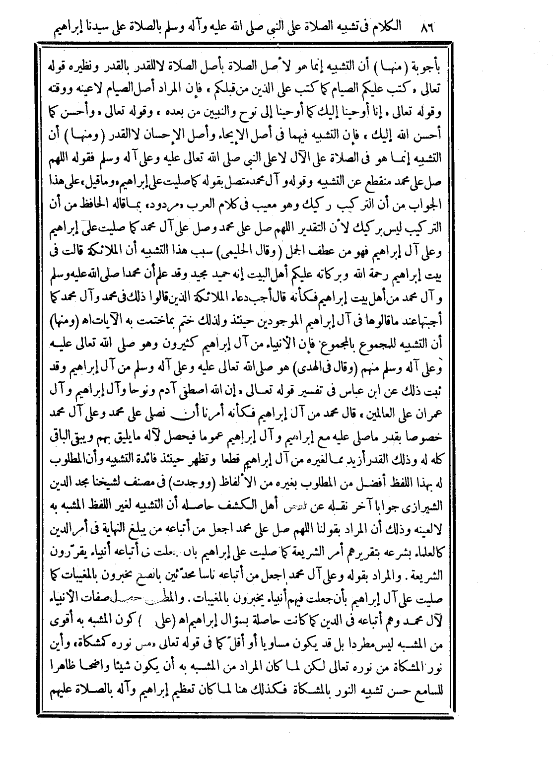 (ووجدت) في مصنف لشيخنا مجد الدين الشيرازي جوابًا آخر نقله عن بعض أهل الكشف حاصله أن التشبيه لغير اللفظ المشبه به لا لعينه وذلك أن المراد بقولنا اللهم صل على محمَّد اجعل من أتباعه من يبلغ النهاية في أمر الدين كالعلماء بشرعه بتقريرهم أمر الشريعة كما صليت على إبراهيم بأن جعلت في أتباعه أنبياء يقرّرون الشريعة.
