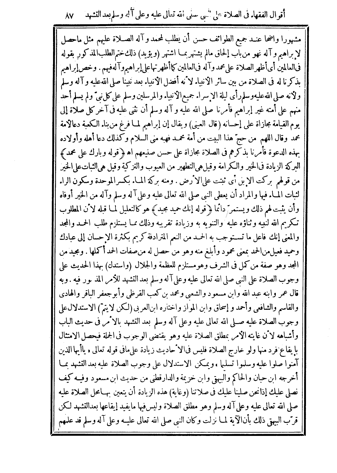 مشهورًا واضحًا عند جميع الطوائف حسن أن يطلب لمحمد وآله الصلاة عليهم مثل ما حصل لإبراهيم وآله فهو من باب إلحاق ما لم يشتهر بما اشتهر (ويؤيد) ذلك ختم الطلب المذكور بقوله في العالمين أي أظهر الصلاة على محمَّد وآله في العالمين كما أظهرتها على إبراهيم وآله فيهم. وخص إبراهيم بذكرنا له في الصلاة من بين سائر الأنبياء لأنه أفضل الأنبياء بعد نبينا صلى الله عليه وآله وسلم ولأنه صلى الله عليه وسلم رأى ليلة الإسراء جميع الأنبياء والمرسلين وسلم على كل نبيّ ولم يسلم أحد منهم على أمته غير إبراهيم فأمرنا صلى الله عليه وآله وسلم أن نثني عليه في آخر كل صلاة إلى يوم القيامة مجازاة على إحسانه (قال العيني) ويقال إن إبراهيم لما فرغ من بناء الكعبة دعالأمة محمَّد وقال اللهم من حجّ هذا البيت من أمة محمَّد فهبه مني السلام وكذلك دعا أهله وأولاده بهذه الدعوة فأمرنا بذكرهم في الصلاة مجازاة على حسن صنيعهم اهـ