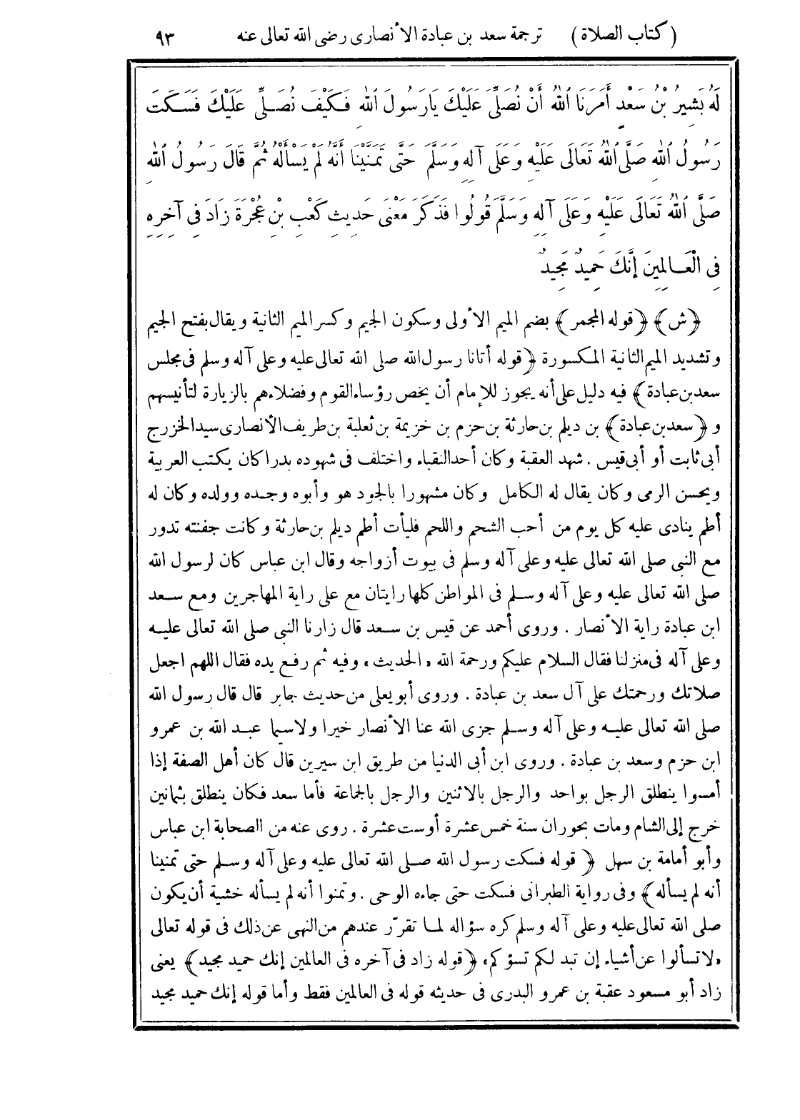 لَهُ بَشِيرُ بْنُ سَعْدٍ أَمَرَنَا الله أَنْ نُصَلِّيَ عَلَيْكَ يَا رَسُولَ اللهِ فَكَيْفَ نُصَلِّي عَلَيْكَ فَسَكَتَ رَسُولُ اللهِ -صَلَّى الله تَعَالَى عَلَيْهِ وَعَلَى آلِهِ وَسَلَّمَ- حَتَّى تَمَنَّيْنَا أَنَّهُ لَمْ يَسْأَلْهُ ثُمَّ قَالَ رَسُولُ اللهِ -صَلَّى الله تَعَالَى عَلَيْهِ وَعَلَى آلِهِ وَسَلَّمَ- "قُولُوا". فَذَكَرَ مَعْنَى حَدِيثِ كَعْبِ بْنِ عُجْرَةَ زَادَ في آخِرِهِ "فِي الْعَالَمِينَ إِنَّكَ حَمِيدٌ مَجِيدٌ".