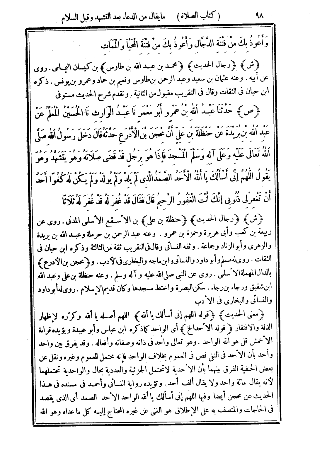 (ص) حَدَّثَنَا عَبْدُ اللهِ بْنُ عَمْرٍو أَبُو مَعْمَرٍ نَا عَبْدُ الْوَارِثِ نَا الْحُسَيْنُ الْمُعَلِّمُ عَنْ عَبْدِ اللهِ بْنِ بُرَيْدَةَ عَنْ حَنْظَلَةَ بْنِ عَلِيٍّ أَنَّ مِحْجَنَ بْنَ الأَدْرَعِ حَدَّثَهُ قَالَ دَخَلَ رَسُولُ اللهِ -صلى الله عليه وسلم- الْمَسْجِدَ فَإِذَا هُوَ بِرَجُلٍ قَدْ قَضَى صَلاَتَهُ وَهُوَ يَتَشَهَّدُ وَهُوَ يَقُولُ اللهُمَّ إِنِّي أَسْأَلُكَ يَا الله الأَحَدُ الصَّمَدُ الَّذِي لَمْ يَلِدْ وَلَمْ يُولَدْ وَلَمْ يَكُنْ لَهُ كُفُوًا أَحَدٌ أَنْ تَغْفِرَ لِي ذُنُوبِي إِنَّكَ أَنْتَ الْغَفُورُ الرَّحِيمُ. قَالَ فَقَالَ "قَدْ غُفِرَ لَهُ قَدْ غُفِرَ لَهُ". ثَلاَثًا.