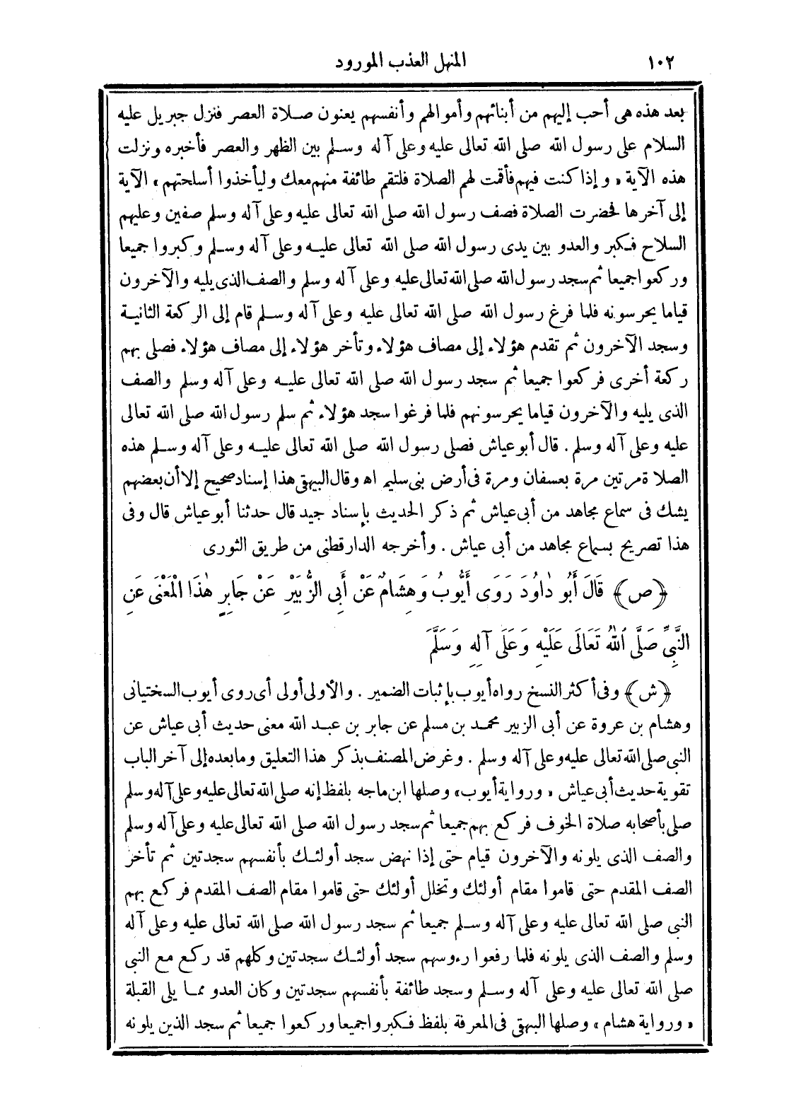 بعد هذه هي أحب إليهم من أبنائهم وأموالهم وأنفسهم يعنون صلاة العصر فنزل جبريل عليه السلام على رسول الله صلي الله تعالى عليه وآله وسلم بين الظهر والعصر فأخبره ونزلت هذه الآية (وَإِذَا كُنْتَ فِيهِمْ فَأَقَمْتَ لَهُمُ الصَّلَاةَ فَلْتَقُمْ طَائِفَةٌ مِنْهُمْ مَعَكَ وَلْيَأْخُذُوا أَسْلِحَتَهُمْ) الآية إلى آخرها فحضرت الصلاة فصف رسول الله صلى الله تعالى عليه وعلى آله وسلم صفين وعليهم السلاح فكبر والعدو بين يدي رسول الله صلى الله تعالى عليه وعلى آله وسلم وكبروا جميعًا وركعوا جميعًا ثم سجد رسول الله صلي الله تعالى عليه وآله وسلم والصف الذي يليه والآخرون قيامًا يحرسونه فلما فرغ رسول الله صلى الله تعالى عليه وعلى آله وسلم قام إلى الركعة الثانية وسجد الآخرون ثم تقدم هؤلاء إلى مصاف هؤلاء وتأخر هؤلاء إلى مصاف هؤلاء فصلى بهم ركعة أخرى فركعوا جميعًا ثم سجد رسول الله صلى الله تعالى عليه وعلى آله وسلم والصف الذي يليه والآخرون قيامًا يحرسونهم فلما فرغوا سجد هؤلاء ثم سلم رسول الله صلى الله تعالى عليه وعلى آله وسلم. قال أبو عياش فصلى رسول الله صلى الله تعالى عليه وعلى آله وسلم هذه الصلاة مرتين مرة بعسفان ومرة في أرض بني سليم اهـ