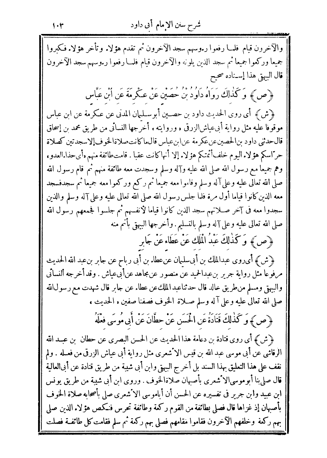 (ش) أي روى الحديث داود بن حصين أبو سليمان المدني عن عكرمة عن ابن عباس موقوفًا عليه مثل رواية أبى عياش الزرقي "وروايته" أخرجها النسائي من طريق محمد بن إسحاق قال حدثني داود بن الحصين عن عكرمة عن اين عباس قال ما كانت صلاة الخوف إلا سجدتين كصلاة حرّاسكم هؤلاء اليوم خلف أئمتكم هؤلاء إلا أنها كانت عقبًا. قامت طائفة منهم "أي حذاء العدو" وهم جميعًا مع رسول الله صلى الله عليه وآله وسلم وسجدت معه طائفة متهم ثم قام رسول الله صلى الله تعالى عليه وعلى آله وسلم وقاموا معه جميعًا ثم ركع وركعوا معه جميعًا ثم سجد فسجد معه الذين كانوا قيامًا أول مرة فلما جلس رسول الله صلي الله تعالى عليه وعلى آله وسلم والذين سجدوا معه في آخر صلاتهم سجد الذين كانوا قيامًا لأنفسهم ثم جلسوا فجمعهم رسول الله صلى الله تعالى عليه وعلى آله وسلم بالتسليم. أخرجها البيهقي بأتم منه