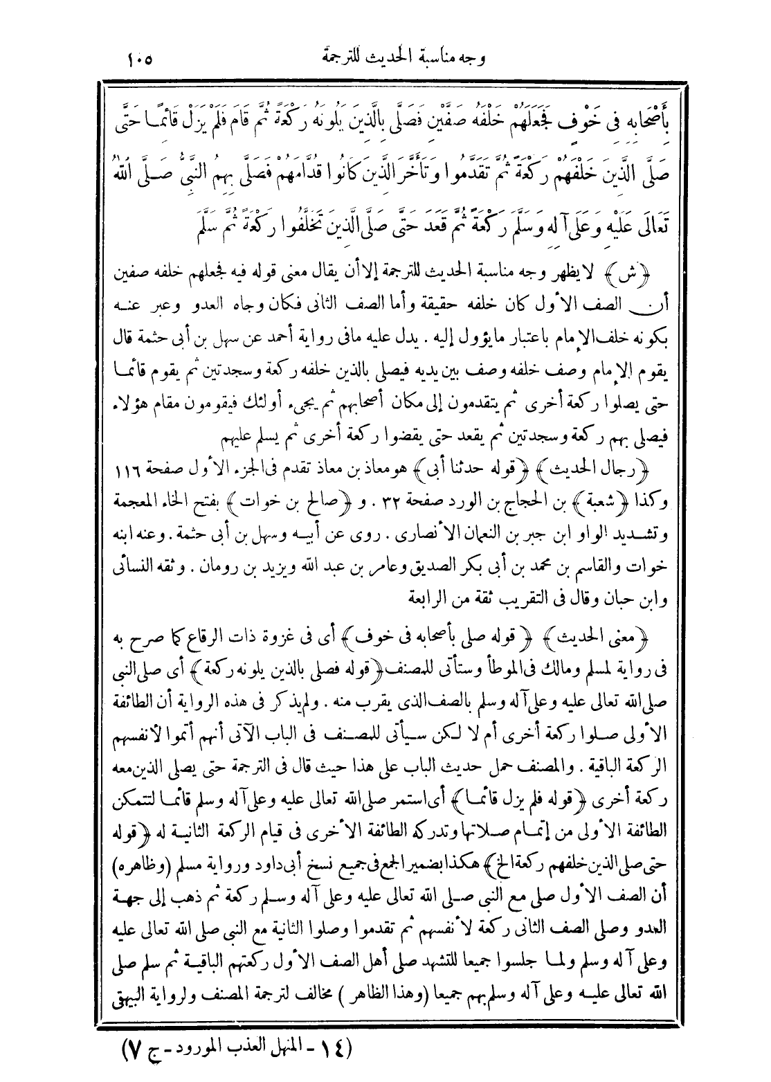 (ش) لا يظهر وجه مناسبة الحديث للترجمة إلا أن يقال معنى قوله فيه فجعلهم خلفه صفين أن الصف الأول كان خلفه حقيقة وأما الصف الثاني فكان وجاه العدو وعبر عنه بكونه خلف الإمام باعتبار ما يؤول إليه. يدل عليه ما في رواية أحمد عن سهل بن أبي حثمة قال يقوم الإمام وصف خلفه وصف بين يديه فيصلي بالذين خلفه ركعة وسجدتين ثم يقوم قائمًا حتى يصلوا ركعة أخرى ثم يتقدمون إلى مكان أصحابهم ثم يجئ أولئك فيقومون مقام هؤلاء فيصلي بهم ركعة وسجدتين ثم يقعد حتى يقضوا ركعة أخرى ثم يسلم عليهم