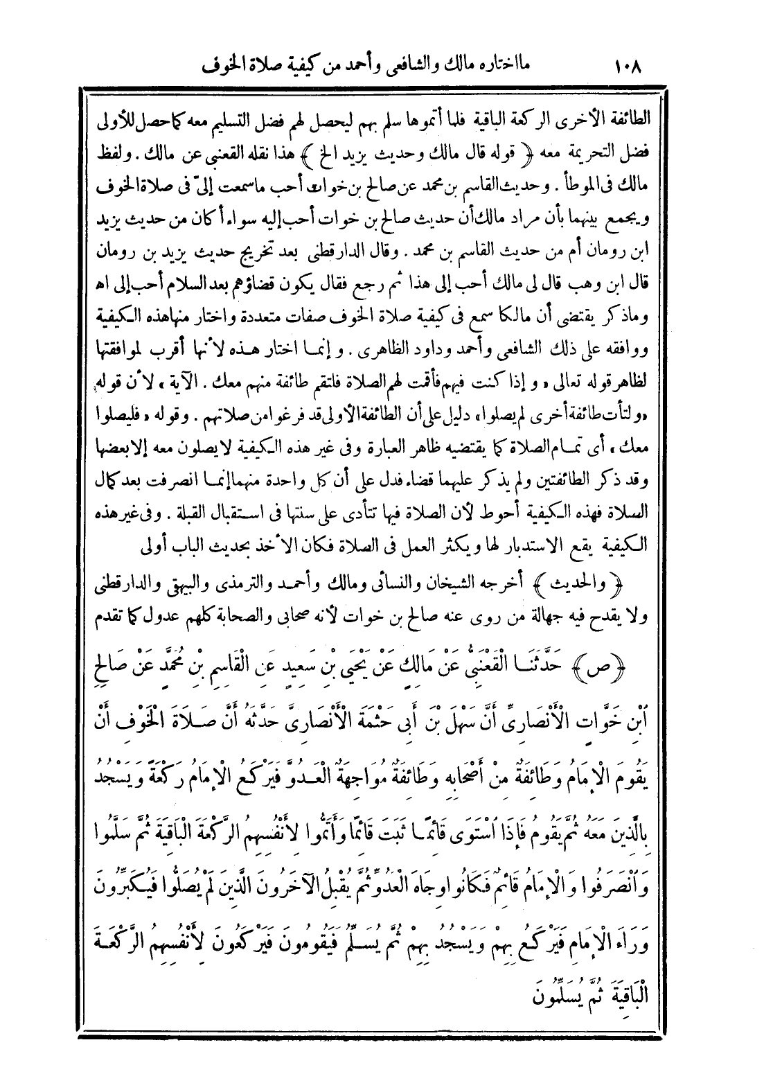 وما ذكر يقتضي أن مالكًا سمع في كيفية صلاة الخوف صفات متعددة واختار منها هذه الكيفية ووافقه على ذلك الشافعي وأحمد وداود الظاهرى. وإنما اختار هذه لأنها أقرب لموافقتها لظاهر قوله تعالى (وَإِذَا كُنْتَ فِيهِمْ فَأَقَمْتَ لَهُمُ الصَّلَاةَ فَلْتَقُمْ طَائِفَةٌ مِنْهُمْ مَعَكَ. الآية) لأن قوله (وَلْتَأْتِ طَائِفَةٌ أُخْرَى لَمْ يُصَلُّوا) دليل على أن الطائفة الأولى قد فرغوا من صلاتهم. وقوله (فَلْيُصَلُّوا مَعَكَ) أي تمام الصلاة كما يقتضيه ظاهر العبارة وفي غير هذه الكيفية لا يصلون معه إلا بعضها وقد ذكر الطائفتين ولم يذكر عليهما قضاء فدل على أن كل واحدة منهما إنما انصرفت بعد كمال الصلاة فهذه الكيفية أحوط لأن الصلاة فيها تتأدى على سنتها في استقبال القبلة. وفي غير هذه الكيفية يقع الاستدبار لها ويكثر العمل في الصلاة فكان الأخذ بحديث الباب أولى