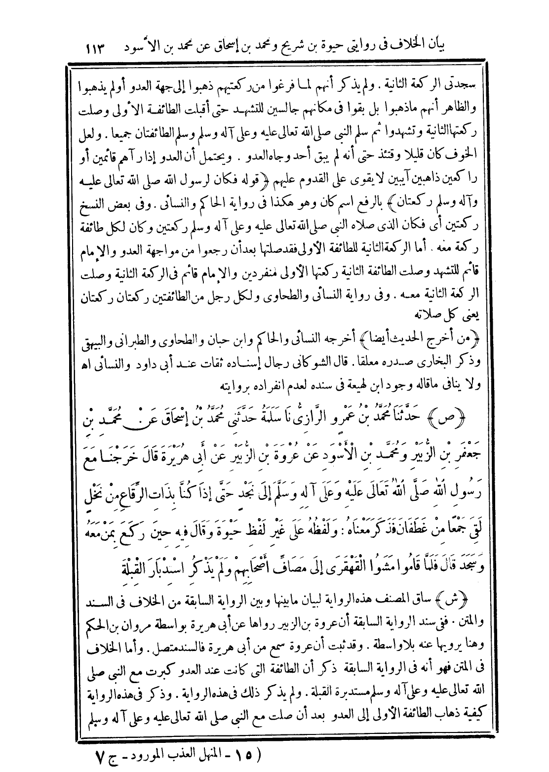 (ش) ساق المصنف هذه الرواية لبيان ما بينها وبين الرواية السابقة من الخلاف في السند والمتن. ففي سند الرواية السابقة أن عروة بن الزبير رواها عن أبي هريرة بواسطة مروان بن الحكم وهنا يرويها عنه بلا واسطة. وقد ثبت أن عروة سمع من أبى هريرة فالسند متصل. وأما الخلاف في المتن فهو أنه في الرواية السابقة ذكر أن الطائفة التى كانت عند العدو كبرت مع النبي صلى الله تعالى عليه وعلى آله وسلم مستدبرة القبلة. ولم يذكر ذلك في هذه الرواية. وذكر في هذه الرواية كيفية ذهاب الطائفة الأولى إلى العدو بعد أن صلت مع النبي صلى الله تعالى عليه وعلى آله وسلم
