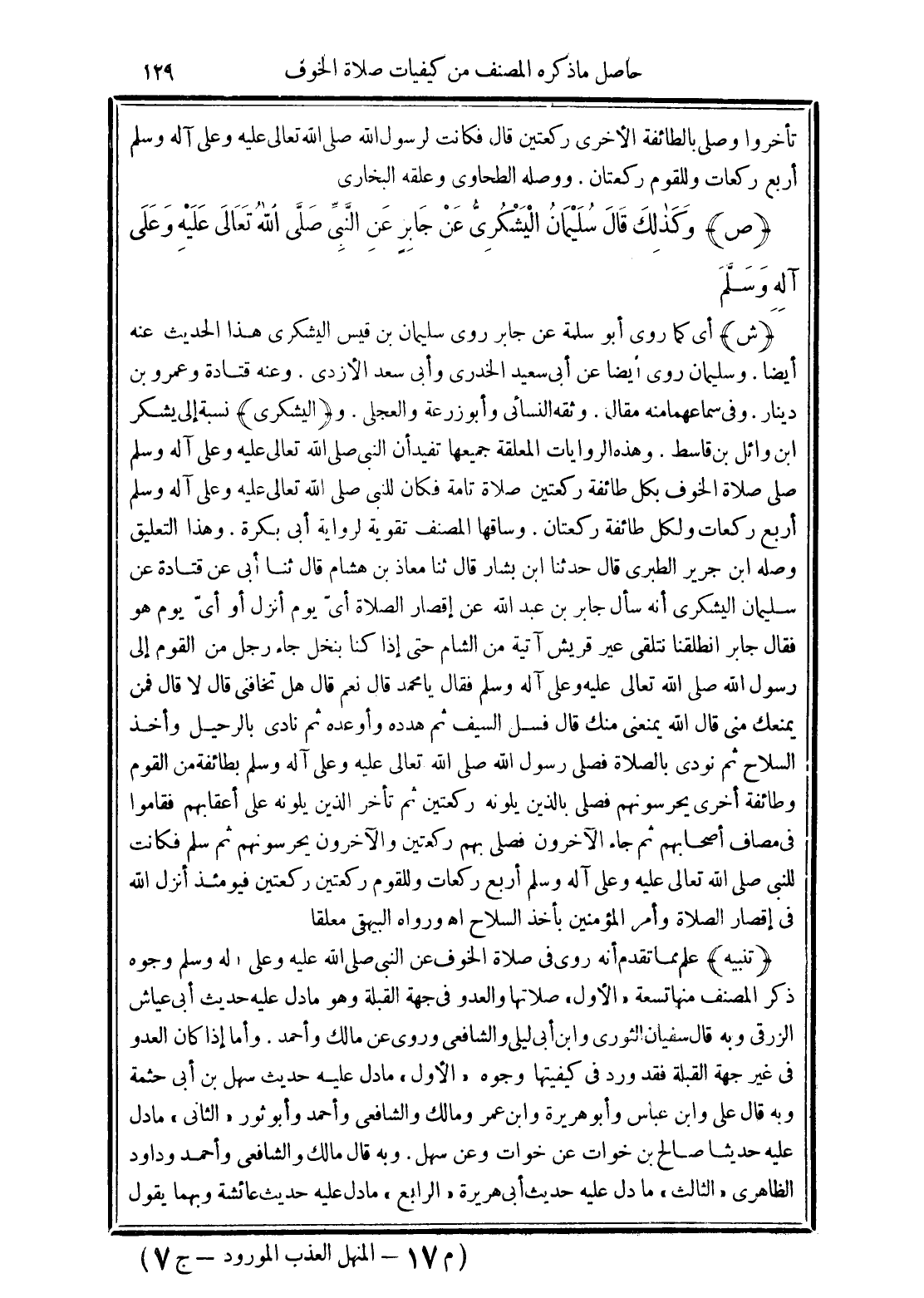 (ش) أي كما روى أبو سلمة عن جابر روى سليمان بن قيس اليشكري هذا الحديث عنه أيضًا. وسيمان روى أيضًا عن أبي سعيد الخدري وأبى سعد الأزدي. وعنه قتادة وعمرو بن دينار. وفي سماعها منه مقال. وثقه النسائي وأبو زرعة والعجلي. و (اليشكري) نسبة إلى يشكر ابن وائل بن قاسط. وهذه الروايات المعلقة جميعها تفيد أن النبي صلى الله تعالى عليه وعلى آله وسلم صلى صلاة الخوف بكل طائفة ركعتين صلاة تامة فكان للنبي صلى الله تعالى عليه وعلى آله وسلم أربع ركعات ولكل طائفة ركعتان. وساقها المصنف تقوية لرواية أبى بكرة. وهذا التعليق وصله ابن جرير الطبري قال حدثنا ابن بشار قال ثنا معاذ بن هشام قال ثنا أبى عن قتادة عن سيمان اليشكري أنه سأل جابر بن عبد الله عن إقصار الصلاة أي يوم أنزل أو أيّ يوم هو فقال جابر انطلقنا نتلقى عير قريش آتية من الشام حتى إذا كنا بنخل جاء رجل من القوم إلى رسول الله صلى الله تعالى عليه وعلى آله وسلم فقال يا محمد قال نعم قال هل تخافني قال لا قال فن يمنعك مني قال الله يمنعني منك قال فسل السيف ثم هدده وأوعده ثم نادى بالرحيل وأخذ السلاح ثم نودى بالصلاة فصلى رسول الله صلى الله تعالى عليه وعلي آله وسلم بطائفة من القوم وطائفة أخرى يحرسونهم فصلى بالذين يلونه ركعتين ثم تأخر الذين يلونه على أعقابهم فقاموا في مصاف أصحابهم ثم جاء الآخرون فصلى بهم ركعتين والآخرون يحرسونهم ثم سلم فكانت للنبي صلى الله تعالى عليه وعلى آله وسلم أربع ركعات وللقوم ركعتين ركعتين فيومئذ أنزل الله في إقصار الصلاة وأمر المؤمنين بأخذ السلاح اهـ ورواه البيهقي معلقًا