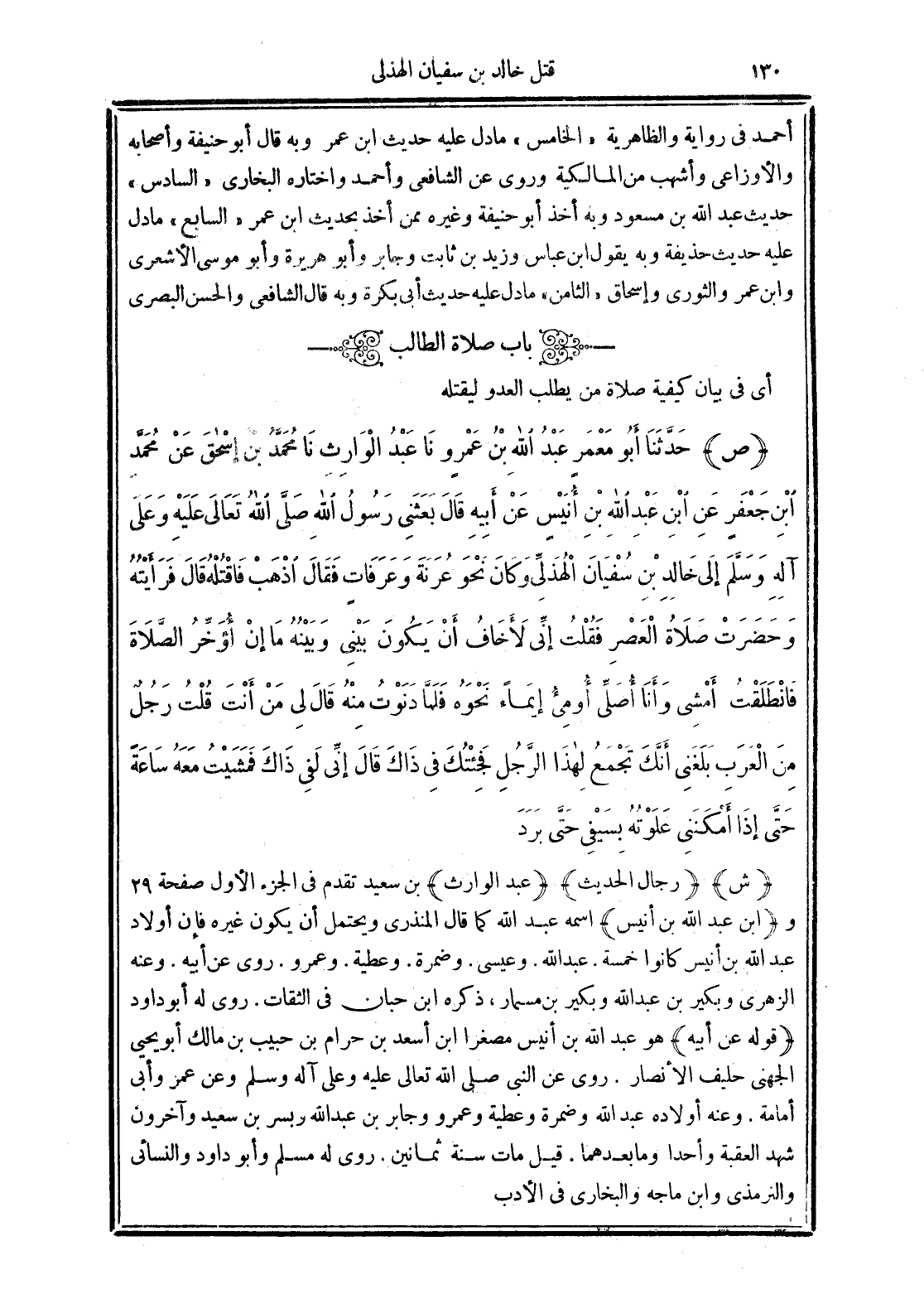 (ص) حَدَّثَنَا أَبُو مَعْمَرٍ عَبْدُ اللَّهِ بْنُ عَمْرٍو نَا عَبْدُ الْوَارِثِ نَا مُحَمَّدُ بْنُ إِسْحَاقَ عَنْ مُحَمَّدِ بْنِ جَعْفَرٍ عَنِ ابْنِ عَبْدِ اللَّهِ بْنِ أُنَيْسٍ عَنْ أَبِيهِ قَالَ بَعَثَنِي رَسُولُ اللَّهِ -صَلَّى الله تَعَالَى عَلَيْهِ وَعَلَى آلِهِ وَسَلَّمَ- إِلَى خَالِدِ بْنِ سُفْيَانَ الْهُذَلِيِّ -وَكَانَ نَحْوَ عُرَنَةَ وَعَرَفَاتٍ- فَقَالَ "اذْهَبْ فَاقْتُلْهُ". قَالَ فَرَأَيْتُهُ وَحَضَرَتْ صَلاَةُ الْعَصْرِ فَقُلْتُ إِنِّي لأَخَافُ أَنْ يَكُونَ بَيْنِي وَبَيْنَهُ مَا إِنْ أُؤَخِّرُ الصَّلاَةَ فَانْطَلَقْتُ أَمْشِي وَأَنَا أُصَلِّي أُومِئُ إِيمَاءً نَحْوَهُ فَلَمَّا دَنَوْتُ مِنْهُ قَالَ لِي مَنْ أَنْتَ قُلْتُ رَجُلٌ مِنَ الْعَرَبِ بَلَغَنِي أَنَّكَ تَجْمَعُ لِهَذَا الرَّجُلِ فَجِئْتُكَ فِي ذَاكَ. قَالَ إِنِّى لَفِي ذَاكَ فَمَشَيْتُ مَعَهُ سَاعَةً حَتَّى إِذَا أَمْكَنَنِي عَلَوْتُهُ بِسَيْفِى حَتَّى بَرَدَ.