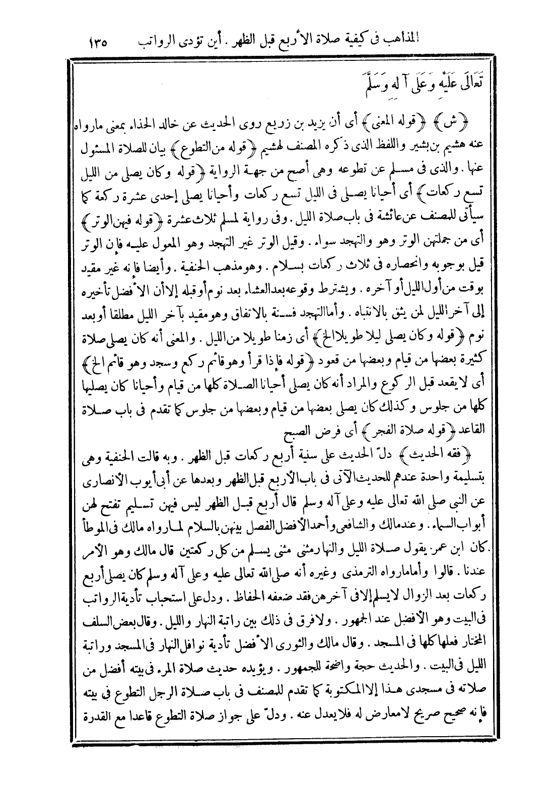 (فقه الحديث) دلّ الحديث على سنية أربع ركعات قبل الظهر. وبه قالت الحنفية وهي بتسليمة واحدة عندهم للحديث الآتي في باب الأربع قبل الظهر وبعدها عن أبي أيوب الأنصاري عن النبي صلى الله تعالى عليه وعلى آله وسلم قال أربع قبل الظهر ليس فيهن تسليم تفتح لهن أبواب السماء. وعند مالك والشافعي وأحمد الأفضل الفصل بينهن بالسلام لما رواه مالك في الموطأ كان ابن عمر يقول صلاة الليل والنهار مثنى مثنى يسلم من كل ركعتين قال مالك وهو الأمر عندنا. قالوا وأما ما رواه الترمذي وغيره أنه صلى الله تعالى عليه وعلى آله وسلم كان يصلي أربع ركعات بعد الزوال لا يسلم إلا في آخرهن فقد ضعفه الحفاظ. ودل على استحباب تأدية الرواتب في البيت وهو الأفضل عند الجمهور. ولا فرق في ذلك بين راتبة النهار والليل. وقال بعض السلف المختار فعلها كلها في المسجد. وقال مالك والثوري الأفضل تأدية نوافل النهار في المسجد وراتبة الليل في البيت. والحديث حجة واضحة للجمهور. ويؤيده حديث صلاة المرء في بيته أفضل من صلاته في مسجدي هذا إلا المكتوبة كما تقدم للمصنف في باب صلاة الرجل التطوع في بيته فإنه صحيح صريح لا معارض له فلا يعدل عنه. ودلّ على جواز صلاة التطوع قاعدًا مع القدرة