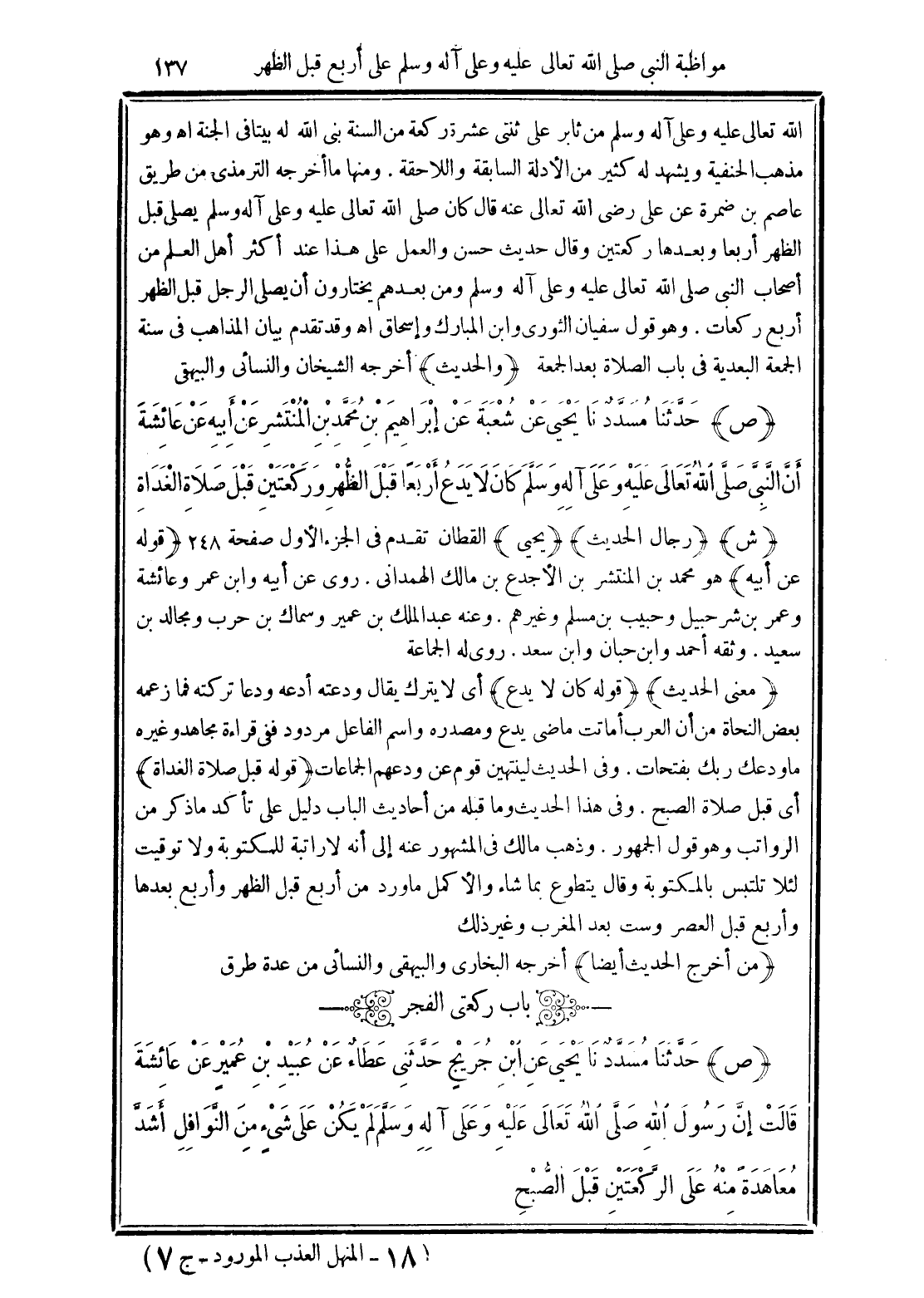 (ص) حَدَّثَنَا مُسَدَّدٌ نَا يَحْيَى عَنْ شُعْبَةَ عَنْ إِبْرَاهِيمَ بْنِ مُحَمَّدِ بْنِ الْمُنْتَشِرِ عَنْ أَبِيهِ عَنْ عَائِشَةَ أَنَّ النَّبِيَّ -صَلَّى الله تَعَالَى عَلَيْهِ وَعَلَى آلِهِ وَسَلَّمَ- كَانَ لاَ يَدَعُ أَرْبَعًا قَبْلَ الظُّهْرِ وَرَكْعَتَيْنِ قَبْلَ صَلاَةِ الْغَدَاةِ.