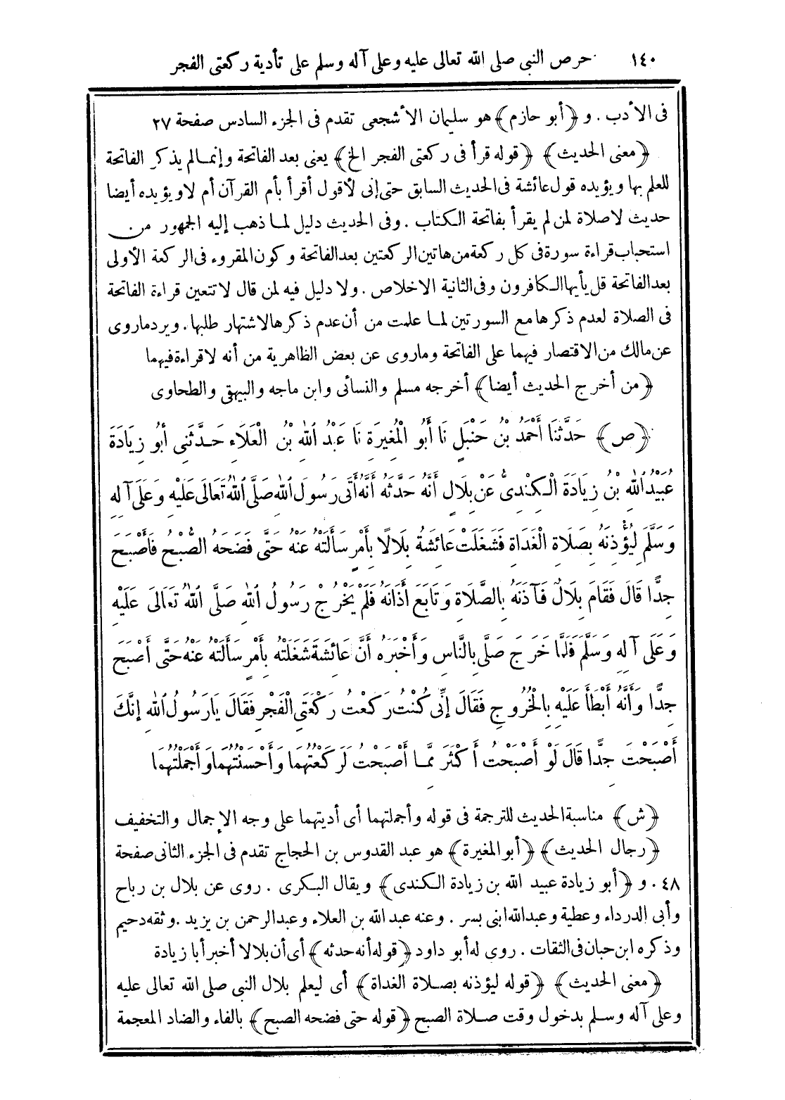 (ص) حَدَّثَنَا أَحْمَدُ بْنُ حَنْبَلٍ نَا أَبُو الْمُغِيرَةِ نَا عَبْدُ اللَّهِ بْنُ الْعَلاَءِ حَدَّثَنِي أَبُو زِيَادَةَ عُبَيْدُ اللَّهِ بْنُ زِيَادٍ الْكِنْدِيُّ عَنْ بِلاَلٍ أَنَّهُ حَدَّثَهُ أَنَّهُ أَتَى رَسُولَ اللَّهِ -صَلَّى الله تَعَالَى عَلَيْهِ وَعَلَى آلِهِ وَسَلَّمَ- لِيُؤْذِنَهُ بِصَلاَةِ الْغَدَاةِ فَشَغَلَتْ عَائِشَةُ بِلاَلًا بِأَمْرٍ سَأَلَتْهُ عَنْهُ حَتَّى فَضَحَهُ الصُّبْحُ فَأَصْبَحَ جِدًّا قَالَ فَقَامَ بِلاَلٌ فَآذَنَهُ بِالصَّلاَةِ وَتَابَعَ أَذَانَهُ فَلَمْ يَخْرُجْ رَسُولُ اللَّهِ -صَلَّى الله تَعَالَى عَلَيْهِ وَعَلَى آلِهِ وَسَلَّمَ- فَلَمَّا خَرَجَ صَلَّى بِالنَّاسِ وَأَخْبَرَهُ أَنَّ عَائِشَةَ شَغَلَتْهُ بِأَمْرٍ سَأَلَتْهُ عَنْهُ حَتَّى أَصْبَحَ جِدًّا وَأَنَّهُ أَبْطَأَ عَلَيْهِ بِالْخُرُوجِ فَقَالَ "إِنِّى كُنْتُ رَكَعْتُ رَكْعَتَيِ الْفَجْرِ". فَقَالَ يَا رَسُولَ اللَّهِ إِنَّكَ أَصْبَحْتَ جِدًّا. قَالَ "لَوْ أَصْبَحْتُ أَكْثَرَ مِمَّا أَصْبَحْتُ لَرَكَعْتُهُمَا وَأَحْسَنْتُهُمَا وَأَجْمَلْتُهُمَا".