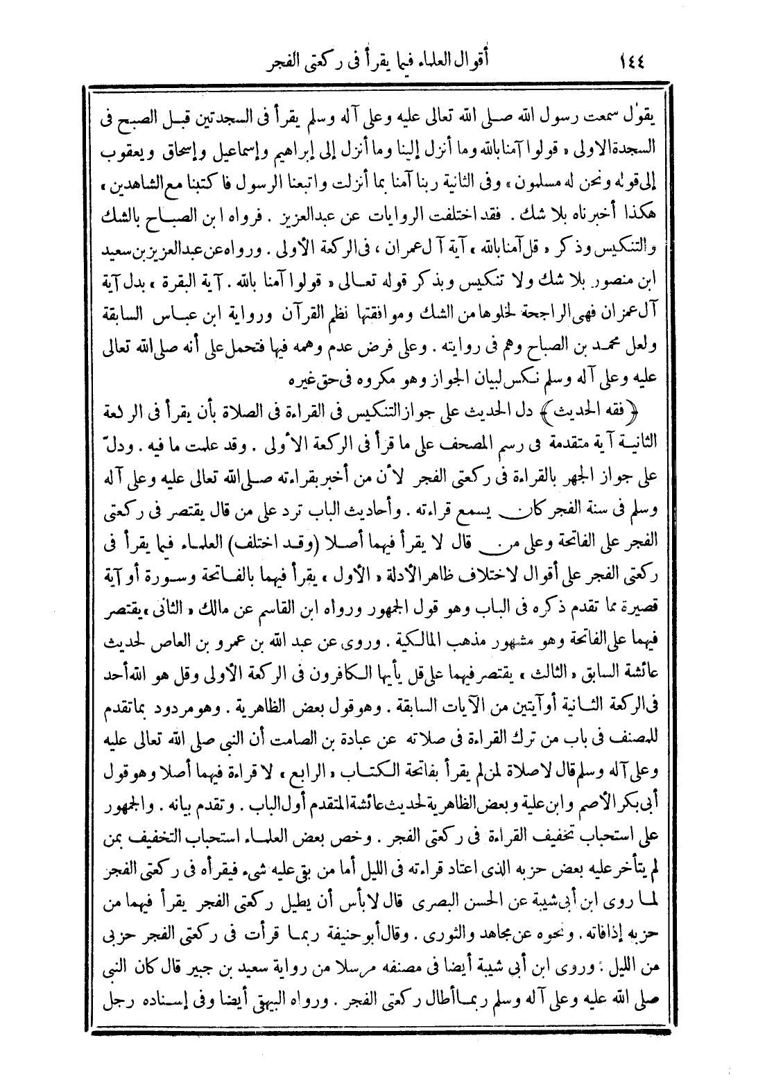 يقول سمعت رسول الله صلى الله تعالى عليه وعلى آله وسلم يقرأ في السجدتين قبل الصبح في السجدة الأولى (قُولُوا آمَنَّا بِاللَّهِ وَمَا أُنْزِلَ إِلَيْنَا وَمَا أُنْزِلَ إِلَى إِبْرَاهِيمَ وَإِسْمَاعِيلَ وَإِسْحَاقَ وَيَعْقُوبَ وَالْأَسْبَاطِ وَمَا أُوتِيَ مُوسَى وَعِيسَى وَمَا أُوتِيَ النَّبِيُّونَ مِنْ رَبِّهِمْ لَا نُفَرِّقُ بَيْنَ أَحَدٍ مِنْهُمْ وَنَحْنُ لَهُ مُسْلِمُونَ) وفي الثانية (رَبَّنَا آمَنَّا بِمَا أَنْزَلْتَ وَاتَّبَعْنَا الرَّسُولَ فَاكْتُبْنَا مَعَ الشَّاهِدِينَ) هكذا أخبرناه بلا شك. فقد اختلفت الروايات عن عبد العزيز. فرواه ابن الصباح بالشك والتنكيس وذكر (قُلْ آمَنَّا بِاللَّهِ) آية آل عمران، في الركعة الأولى. ورواه عن عبد العزيز بن سعيد ابن منصور بلا شك ولا تنكيس وبذكر قوله تعالى (قُولُوا آمَنَّا بِاللَّهِ). آية البقرة. بدل آية آل عمران فهي الراجحة لخلوها من الشك وموافقتها نظم القرآن ورواية ابن عباس السابقة ولعل محمد بن الصباح وهم في روايته. وعلى فرض عدم وهمه فيها فتحمل على أنه صلى الله تعالى عليه وعلى آله وسلم نكس لبيان الجواز وهو مكروه في حق غيره.