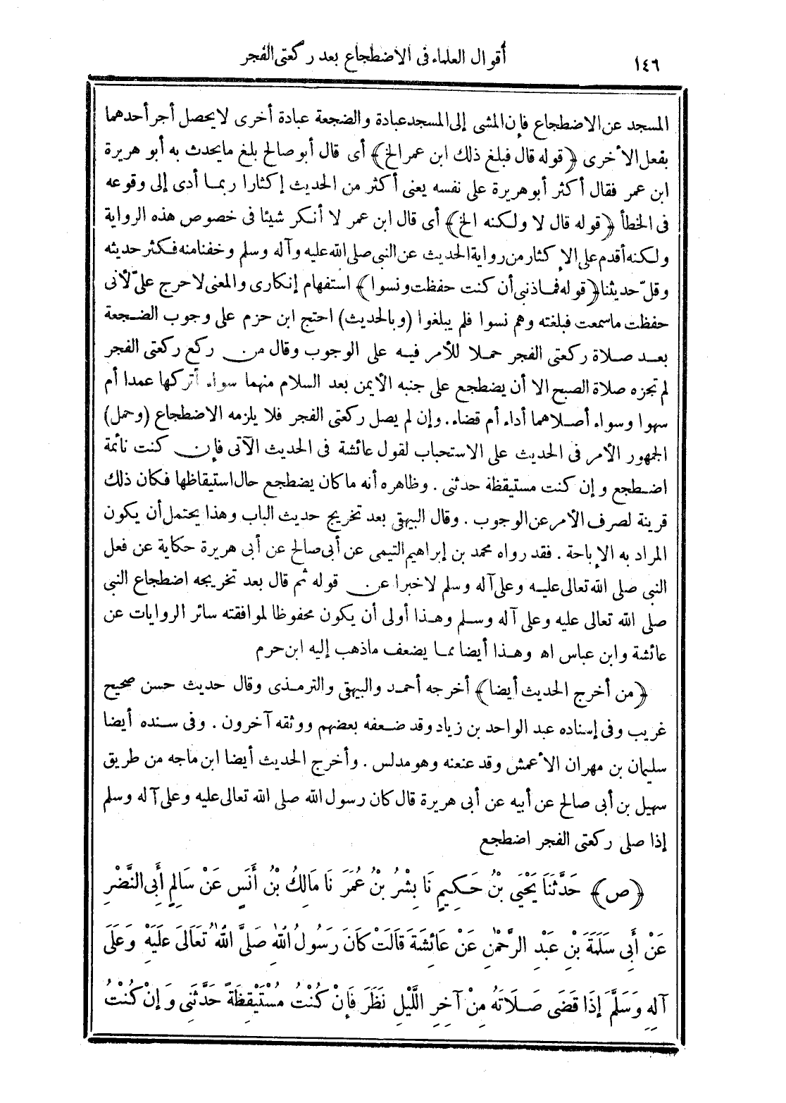 (وحمل) الجمهور الأمر في الحديث على الاستحباب لقول عائشة في الحديث الآتي فإن كنت نائمة اضطجع وإن كنت مستيقظة حدثني وظاهره أنه ما كان يضطجع حال استيقاظها فكان ذلك قرينة لصرف الأمر عن الوجوب. وقال البيهقي بعد تخريج حديث الباب وهذا يحتمل أن يكون المراد به الإباحة. فقد رواه محمد بن إبراهيم التيمي عن أبي صالح عن أبى هريرة حكاية عن فعل النبي صلى الله تعالى عليه وعلى آله وسلم لا خبرًا عن قوله ثم قال بعد تخريجه اضطجاع النبي صلى الله تعالى عليه وآله وسلم وهذا أولى أن يكون محفوظًا لموافقته سائر الروايات عن عائشه وابن عباس اهـ وهذا أيضًا مما يضعف ما ذهب إليه ابن حزم