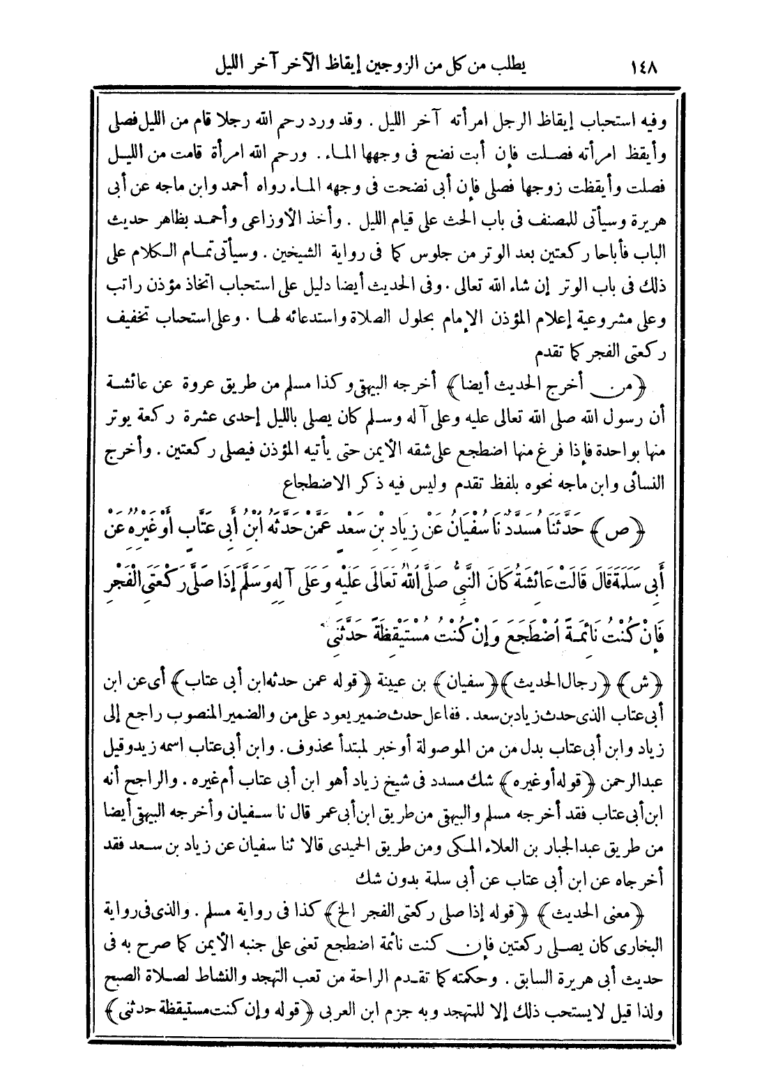 (ص) حَدَّثَنَا مُسَدَّدٌ نَا سُفْيَانُ عَنْ زِيَادِ بْنِ سَعْدٍ عَمَّنْ حَدَّثَهُ -ابْنِ أَبِي عَتَّابٍ أَوْ غَيْرِهِ- عَنْ أَبِي سَلَمَةَ قَالَ قَالَتْ عَائِشَةُ كَانَ النَّبِيُّ -صَلَّى الله تَعَالَى عَلَيْهِ وَعَلَى آلِهِ وَسَلَّمَ- إِذَا صَلَّى رَكْعَتَيِ الْفَجْرِ فَإِنْ كُنْتُ نَائِمَةً اضْطَجَعَ وَإِنْ كُنْتُ مُسْتَيْقِظَةً حَدَّثَنِي.