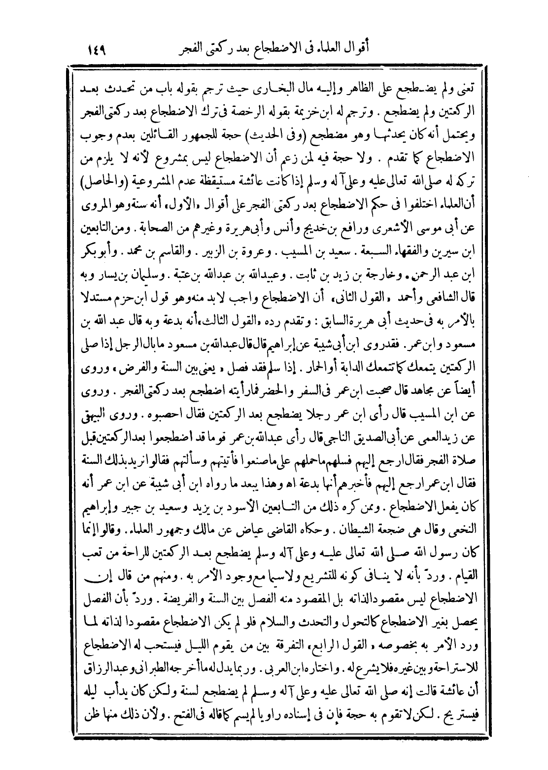 "القول الثالث" أنه بدعة وبه قال عبد الله بن مسعود وابن عمر. فقد روى ابن أبي شيبة عن إبراهيم قال قال عبد الله بن مسعود ما بال الرجل إذا صلى الركعتين يتمعك كما تتمعك الدابة أو الحمار. إذا سلم فقد فصل "يعني بين السنة والفرض" وروى أيضًا عن مجاهد قال صحبت ابن عمر في السفر والحضر فما رأيته اضطجع بعد ركعتي الفجر. وروى عن ابن المسيب قال رأى ابن عمر رجلًا يضطجع بعد الركعتين فقال احصبوه. وروى البيهقي عن زيد العمى عن أبي الصديق الناجي قال رأى عبد الله بن عمر قومًا قد اضطجعوا بعد الركعتين قبل صلاة الفجر فقال ارجع إليهم فسلهم ما حملهم على ما صنعوا فأتيتهم وسألتهم فقالوا نريد بذلك السنة فقال ابن عمر ارجع إليهم فأخبرهم أنها بدعة اهـ وهذا يبعد ما رواه ابن أبي شيبة عن ابن عمر أنه كان يفعل الاضطجاع. وممن كره ذلك من التابعين الأسود بن يزيد وسعيد بن جبير وإبراهيم النخعي وقال هي ضجعة الشيطان. وحكاه القاضي عياض عن مالك وجمهور العلماء. وقالوا إنما كان رسول الله صلى الله تعالى عليه وعلى آله وسلم يضطجع بعد الركعتين للراحة من تعب القيام. وردّ بأنه لا ينافي كونه للتشريع ولاسيما مع وجود الأمر به. ومنهم من قال إن الاضطجاع ليس مقصودًا لذاته بل المقصود منه الفصل بين السنة والفريضة. وردّ بأن الفصل يحصل بغير الاضطجاع كالتحول والتحدث والسلام فلو لم يكن الاضطجاع مقصودًا لذاته لما ورد الأمر به بخصوصه