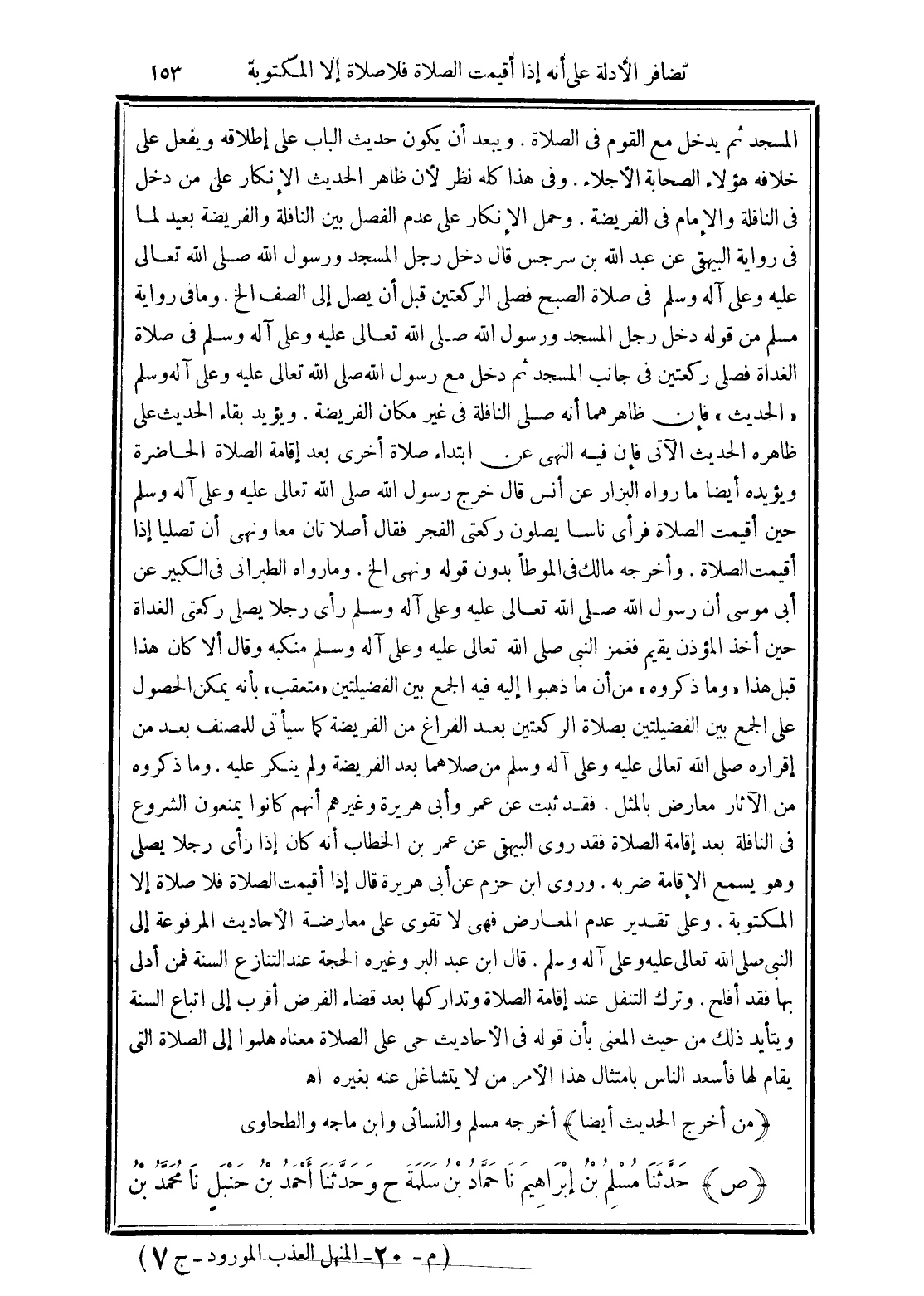 وما رواه الطبراني في الكبير عن أبي موسى أن رسول الله صلى الله تعالى عليه وعلى آله وسلم رأى رجلًا يصلي ركعتي الغداة حين أخذ المؤذن يقيم فغمز النبي صلى الله تعالى عليه وعلى آله وسلم منكبه وقال ألا كان هذا قبل هذا "وما ذكروه" من أن ما ذهبوا إليه فيه الجمع بين الفضيلتين "متعقب" بأنه يمكن الحصول على الجمع بين الفضيلتين بصلاة الركعتين بعد الفراغ من الفريضة كما سيأتي للمصنف بعد من إقراره صلى الله تعالى عليه وعلى آله وسلم من صلاهما بعد الفريضه ولم ينكر عليه. وما ذكروه من الآثار معارض بالمثل. فقد ثبت عن عمر وأبي هريرة وغيرها أنهم كانوا يمنعون الشروع في النافلة بعد إقامة الصلاة فقد روى البيهقي عن عمر بن الخطاب أنه كان إذا رأى رجلًا يصلي وهو يسمع الإقامة ضربه.