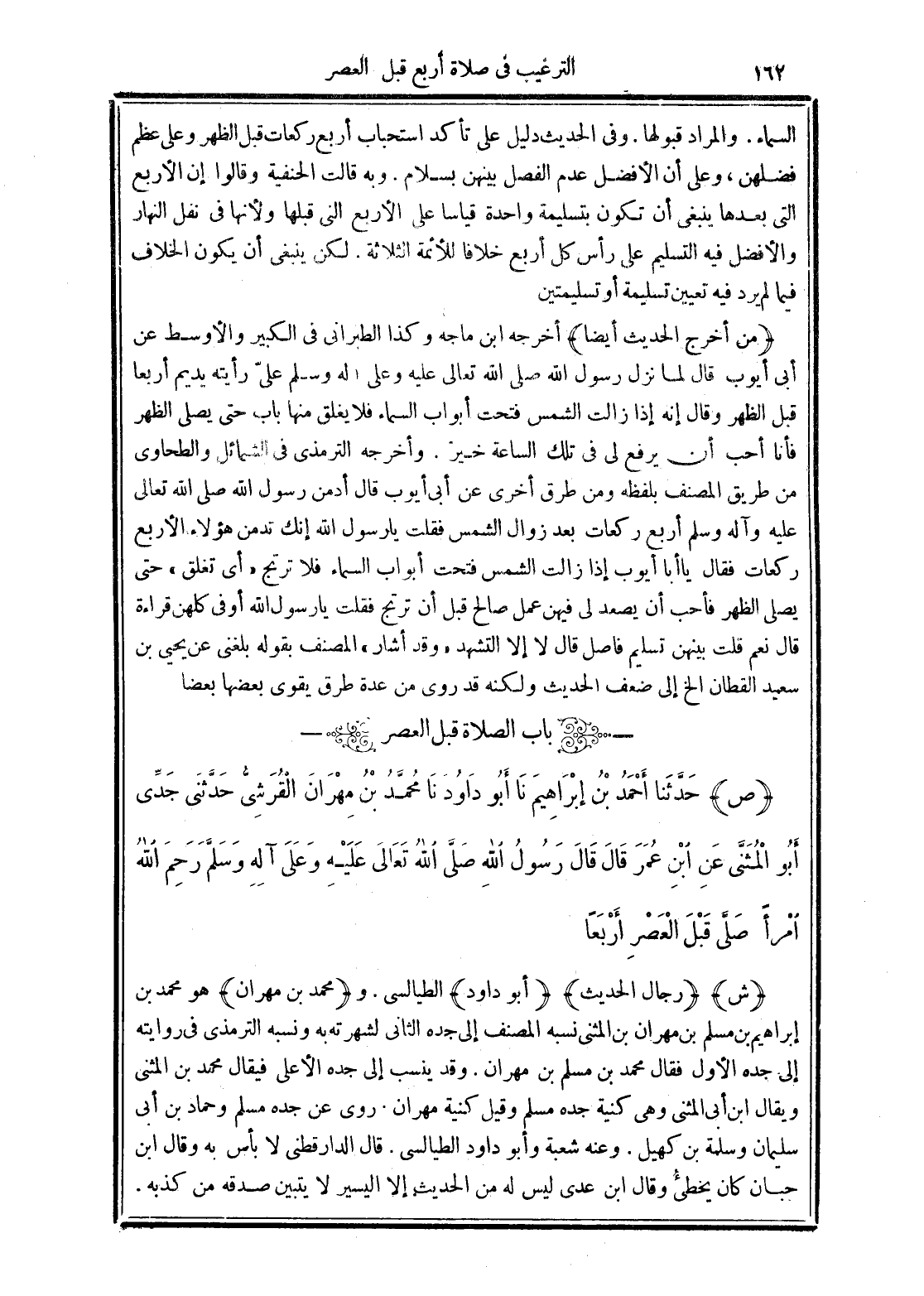 (ص) حَدَّثَنَا أَحْمَدُ بْنُ إِبْرَاهِيمَ نَا أَبُو دَاوُدَ نَا مُحَمَّدُ بْنُ مِهْرَانَ الْقُرَشِيُّ حَدَّثَنِي جَدِّي أَبُو الْمُثَنَّى عَنِ ابْنِ عُمَرَ قَالَ قَالَ رَسُولُ اللَّهِ -صَلَّى الله تَعَالَى عَلَيْهِ وَعَلَى آلِهِ وَسَلَّمَ- "رَحِمَ اللَّهُ امْرَأً صَلَّى قَبْلَ الْعَصْرِ أَرْبَعًا".