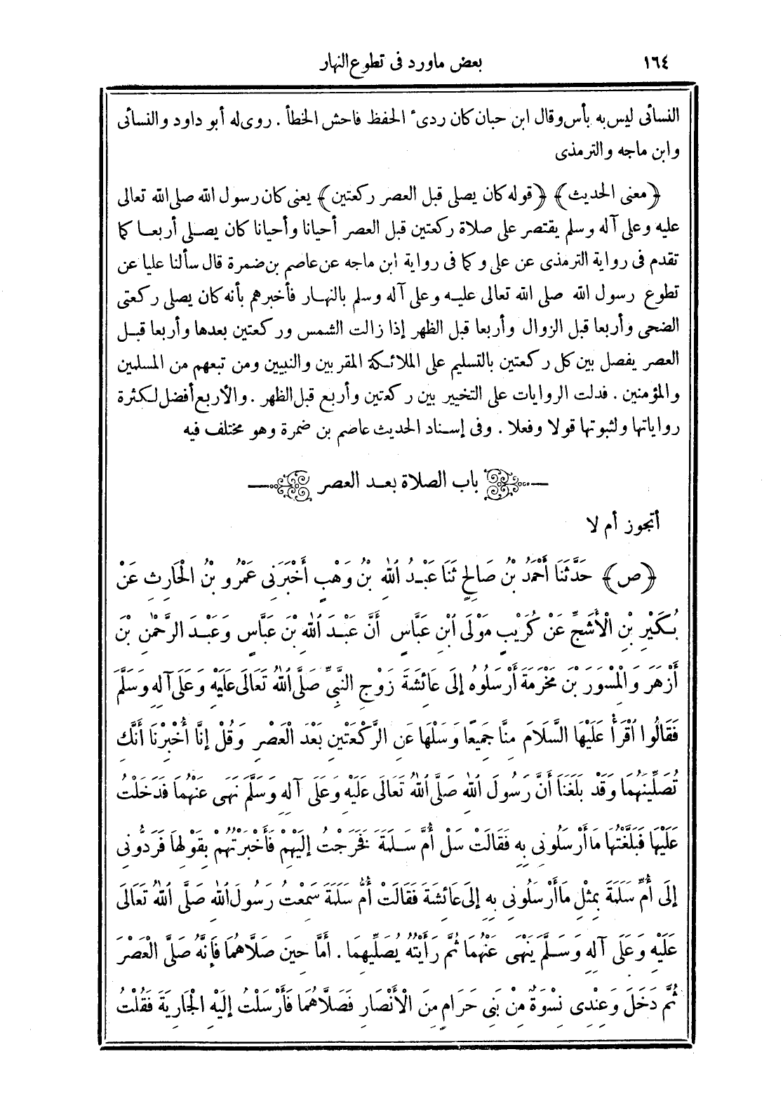 (قوله كان يصلي قبل العصر ركعتين) يعني كان رسول الله صلى الله تعالى عليه وعلى آله وسلم يقتصر على صلاة ركعتين قبل العصر أحيانًا وأحيانًا كان يصلي أربعًا كما تقدم في رواية الترمذي عن علي وكما في رواية ابن ماجه عن عاصم بن ضمرة قال سألنا عليًا عن تطوع رسول الله صلى الله تعالى عليه وعلى آله وسلم بالنهار فأخبرهم بأنه كان يصلي ركعتي الضحى وأربعًا قبل الزوال وأربعًا قبل الظهر إذا زالت الشمس وركعتين بعدها وأربعًا قبل العصر يفصل بين كل ركعتين بالتسليم على الملائكة المقربين والنبيين ومن تبعهم من المسلمين والمؤمنين. فدلت الروايات علي التخيير بين ركعتين وأربع قبل الظهر. والأربع أفضل لكثرة رواياتها ولثبوتها قولًا وفعلًا. وفي إسناد الحديث عاصم بن ضمرة وهو مختلف فيه