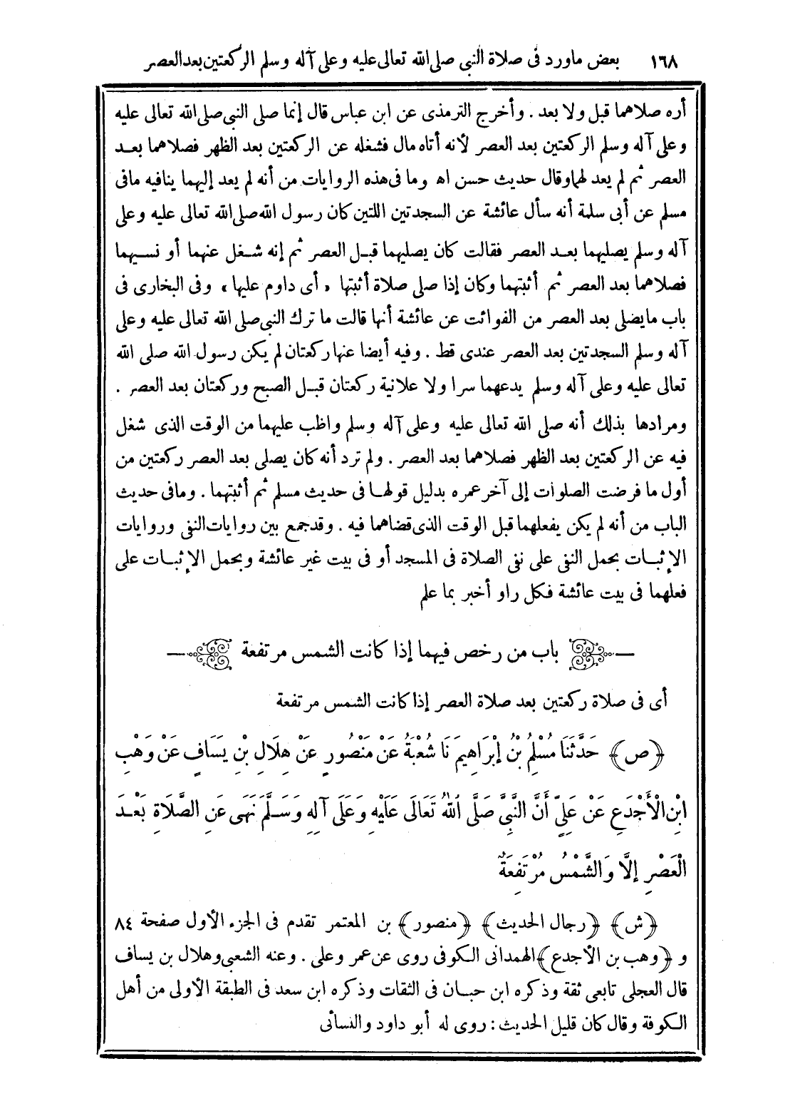 (ص) حَدَّثَنَا مُسْلِمُ بْنُ إِبْرَاهِيمَ نَا شُعْبَةُ عَنْ مَنْصُورٍ عَنْ هِلاَلِ بْنِ يِسَافٍ عَنْ وَهْبِ بْنِ الأَجْدَعِ عَنْ عَلِيٍّ أَنَّ النَّبِيَّ -صَلَّى الله تَعَالَى عَلَيْهِ وَعَلَى آلِهِ وَسَلَّمَ- نَهَى عَنِ الصَّلاَةِ بَعْدَ الْعَصْرِ إِلاَّ وَالشَّمْسُ مُرْتَفِعَةٌ.