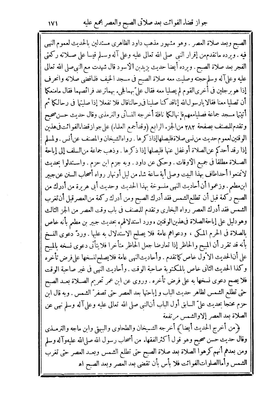 الصبح وبعد صلاة العصر. وهو مشهور مذهب داود الظاهري مستدلين بالحديث لعموم النهي فيه. ويرده ما تقدم من إقرار النبي صلى الله تعالى عليه وعلى آله وسلم قيسًا على صلاته ركعتي الفجر بعد صلاة الصبح. ويرده أيضًا حديث يزيد بن الأسود قال شهدت مع النبي صلى الله تعالى عليه وعلي آله وسلم حجته وصليت معه صلاة الصبح في مسجد الخيف فلما قضى صلاته وانحرف إذا هو برجلين في أخرى القوم لم يصليا معه فقال عليّ بهما فجيء بهما ترعد فرائصهما فقال ما منعكما أن تصليا معنا فقالا يا رسول الله إنا قد كنا صلينا في رحالنا قال فلا تفعلًا إذا صليتما في رحالكم ثم أتيتما مسجد جماعة فصليا معهم فإنهما لكما نافلة أخرجه النسائي والترمذي وقال حديث حسن صحيح وتقدم للمصنف بصفحة 282 من الجزء الرابع