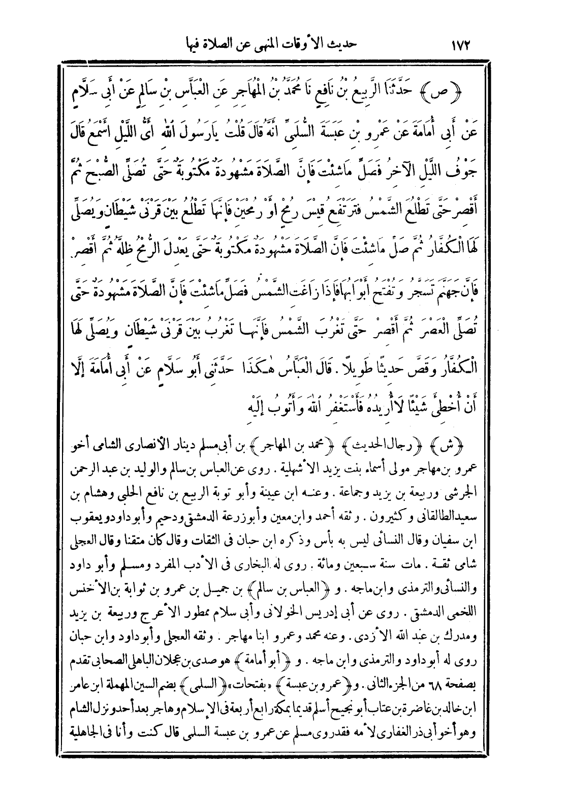 (ص) حَدَّثَنَا الرَّبِيعُ بْنُ نَافِعٍ نَا مُحَمَّدُ بْنُ الْمُهَاجِرِ عَنِ الْعَبَّاسِ بْنِ سَالِمٍ عَنْ أَبِي سَلاَّمٍ عَنْ أَبِي أُمَامَةَ عَنْ عَمْرِو بْنِ عَبَسَةَ السُّلَمِيِّ أَنَّهُ قَالَ قُلْتُ يَا رَسُولَ اللَّهِ أَيُّ اللَّيْلِ أَسْمَعُ قَالَ "جَوْفُ اللَّيْلِ الآخِرُ فَصَلِّ مَا شِئْتَ فَإِنَّ الصَّلاَةَ مَشْهُودَةٌ مَكْتُوبَةٌ حَتَّى تُصَلِّيَ الصُّبْحَ ثُمَّ أَقْصِرْ حَتَّى تَطْلُعَ الشَّمْسُ فَتَرْتَفِعَ قِيْسَ رُمْحٍ أَوْ رُمْحَيْنِ فَإِنَّهَا تَطْلُعُ بَيْنَ قَرْنَيْ شَيْطَانٍ وَتُصَلِّي لَهَا الْكُفَّارُ ثُمَّ صَلِّ مَا شِئْتَ فَإِنَّ الصَّلاَةَ مَشْهُودَةٌ مَكْتُوبَةٌ حَتَّى يَعْدِلَ الرُّمْحُ ظِلَّهُ ثُمَّ أَقْصِرْ فَإِنَّ جَهَنَّمَ تُسْجَرُ وَتُفْتَحُ أَبْوَابُهَا فَإِذَا زَاغَتِ الشَّمْسُ فَصَلِّ مَا شِئْتَ فَإِنَّ الصَّلاَةَ مَشْهُودَةٌ حَتَّى تُصَلِّيَ الْعَصْرَ ثُمَّ أَقْصِرْ حَتَّى تَغْرُبَ الشَّمْسُ فَإِنَّهَا تَغْرُبُ بَيْنَ قَرْنَيْ شَيْطَانٍ وَيُصَلِّي لَهَا الْكُفَّارُ". وَقَصَّ حَدِيثًا طَوِيلًا قَالَ الْعَبَّاسُ هَكَذَا حَدَّثَنِي أَبُو سَلاَّمٍ عَنْ أَبِي أُمَامَةَ إِلاَّ أَنْ أُخْطِئَ شَيْئًا لاَ أُرِيدُهُ فَأَسْتَغْفِرُ اللَّهَ وَأَتُوبُ إِلَيْهِ.
