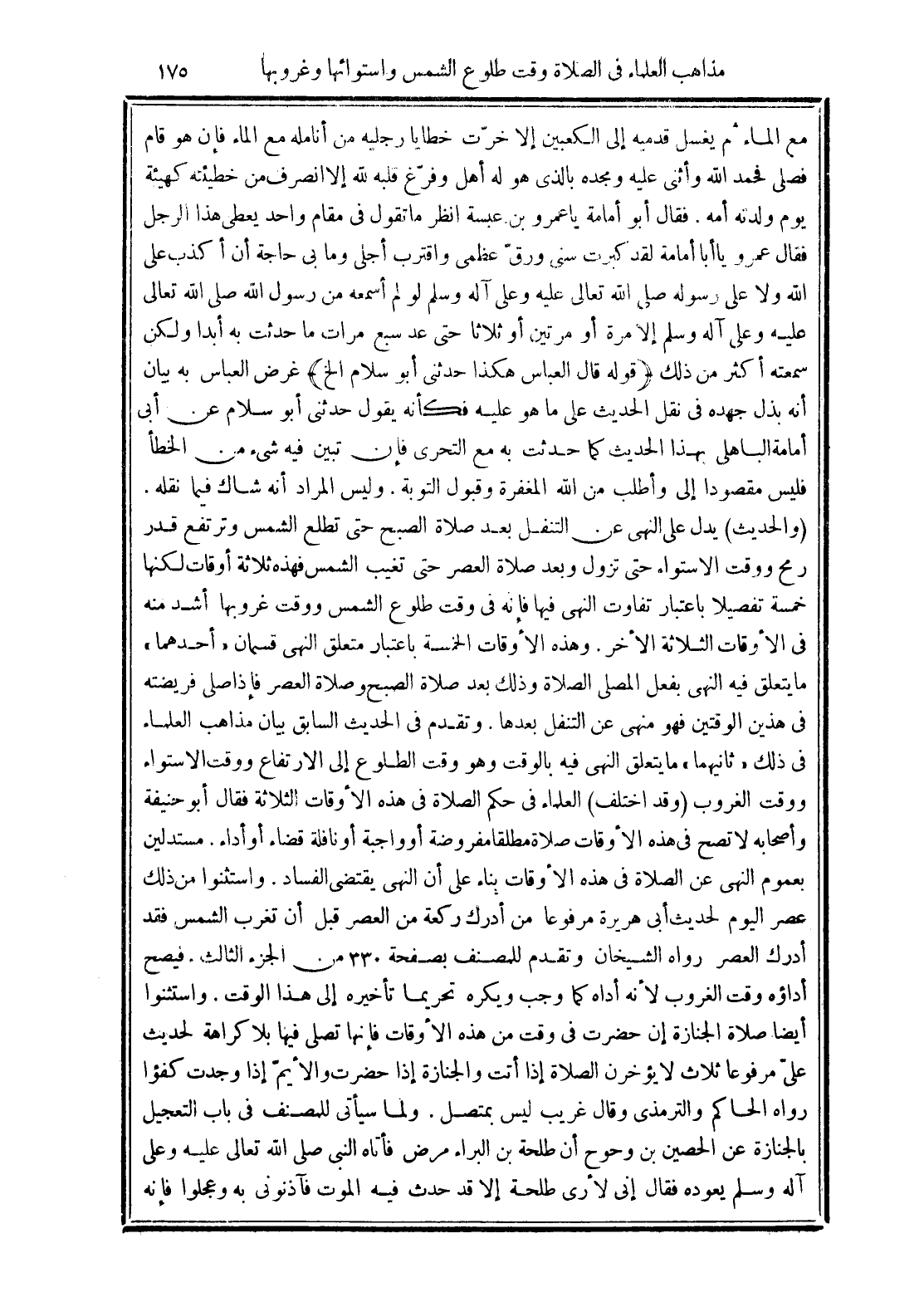 (وقد اختلف) العلماء في حكم الصلاة في هذه الأوقات الثلاثة فقال أبو حنيفة وأصحابه لا تصح في هذه الأوقات صلاة مطلقًا مفروضة أو واجبة أو نافلة قضاء أو أداء. مستدلين بعموم النهي عن الصلاة في هذه الأوقات بناء على أن النهي يقتضي الفساد. واستثنوا من ذلك عصر اليوم لحديث أبي هريرة مرفوعًا من أدرك ركعة من العصر قبل أن تغرب الشمس فقد أدرك العصر رواه الشيخان وتقدم للمصنف بصفحة 330 من الجزء الثالث فيصح أداؤه وقت الغروب لأنه أداه كما وجب ويكره تحريمًا تأخيره إلى هذا الوقت. واستثنوا أيضًا صلاة الجنازة إن حضرت في وقت من هذه الأوقات فإنها تصل فيها بلا كراهة لحديث عليّ مرفوعًا ثلاث لا يؤخرن الصلاة إذا أتت والجنازة إذا حضرت والأيمّ إذا وجدت كفؤا رواه الحاكم والترمذي وقال غريب ليس بمتصل. ولما سيأتي للمصنف في باب التعجيل بالجنازة عن الحصين بن وحوح أن طلحة بن البراء مرض فأتاه النبي صلى الله تعالى عليه وعلى آله وسلم يعوده فقال إني لأرى طلحة إلا قد حدث فيه الموت فآذنوني به وعجلوا فإنه