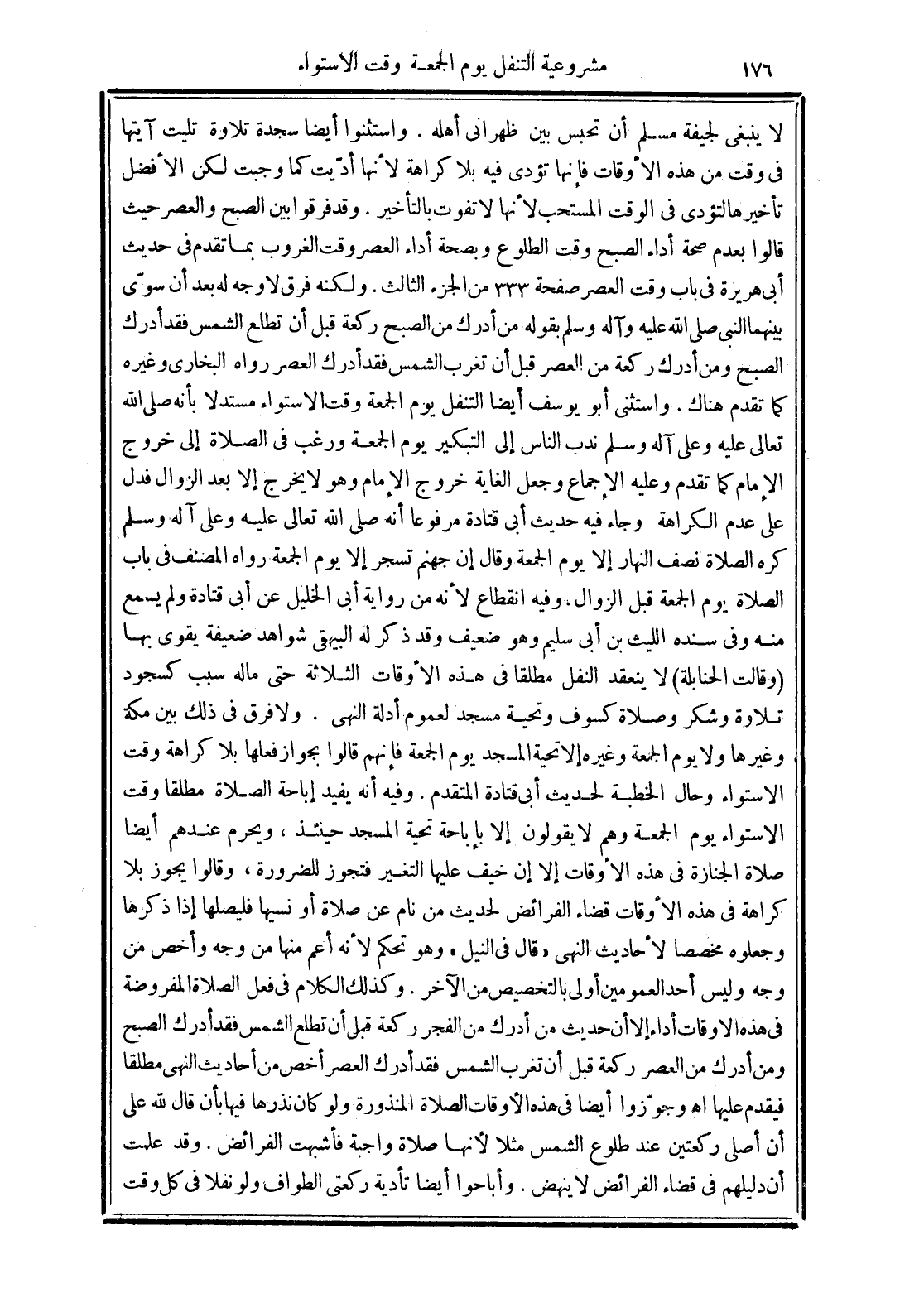 (وقالت الحنابلة) لا ينعقد النفل مطلقًا في هذه الأوقات الثلاثة حتى ما له سبب كسجود تلاوة وشكر وصلاة كسوف وتحية مسجد لعموم أدلة النهي. ولا فرق في ذلك بين مكة وغيرها ولا يوم الجمعة وغيره إلا تحية المسجد يوم الجمعة فإنهم قالوا بجواز فعلها بلا كراهة وقت الاستواء وحال الخطبة لحديث أبي قتادة المتقدم. وفيه أنه يفيد إباحة الصلاة مطلقًا وقت الاستواء يوم الجمعة وهم لا يقولون إلا بإباحة تحية المسجد حينئذ، ويحرم عندهم أيضًا صلاة الجنازة في هذه الأوقات إلا إن خيف عليها التغير فتجوز للضرورة، وقالوا يجوز بلا كراهة في هذه الأوقات قضاء الفرائض لحديث من نام عن صلاة أو نسيها فليصلها إذا ذكرها وجعلوه مخصصًا لأحاديث النهي