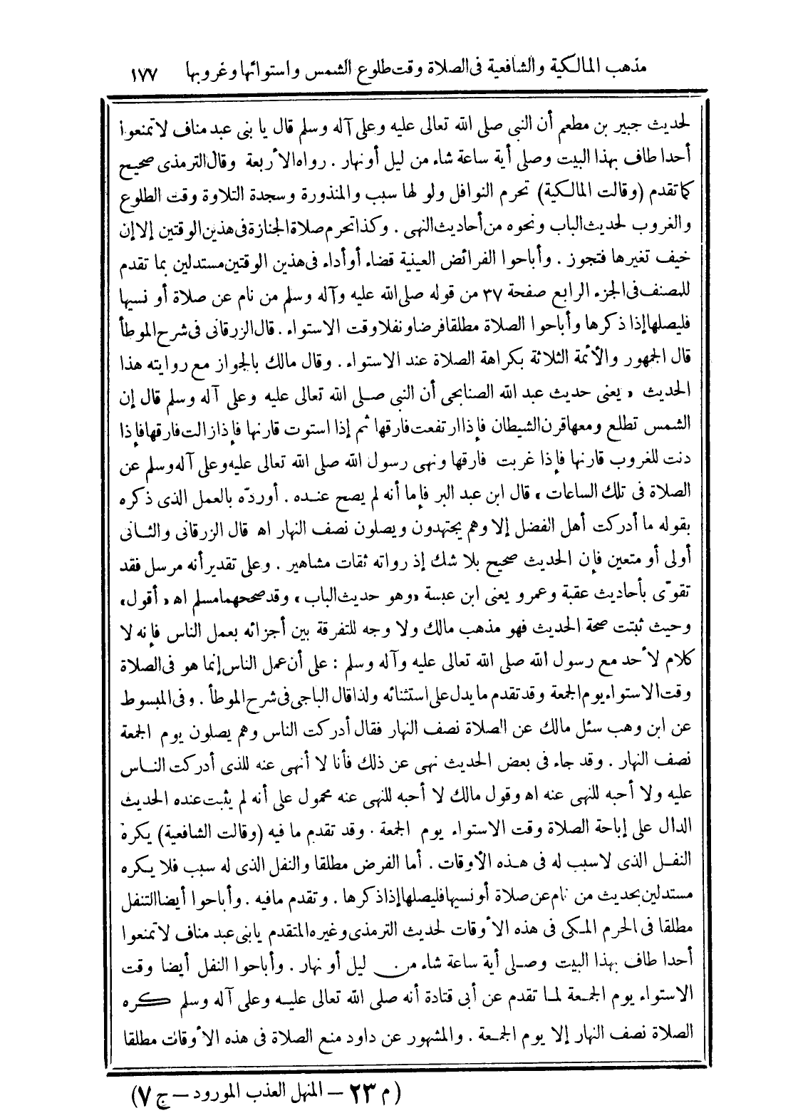 (وقالت المالكية) تحرم النوافل ولو لها سبب والمنذورة وسجدة التلاوة وقت الطلوع والغروب لحديث الباب ونحوه من أحاديث النهي. وكذا تحرم صلاة الجنازة في هذين الوقتين إلا إن خيف تغيرها فتجوز.