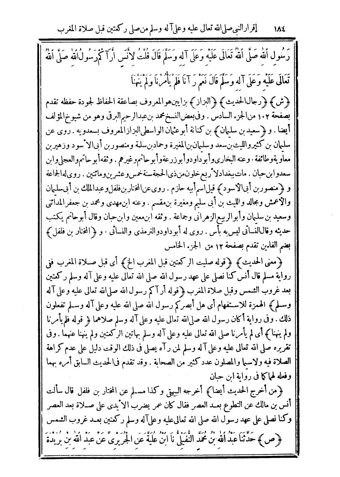 رواية مسلم قال أنس كنا نصلي على عهد رسول الله صلى الله تعالى عليه وعلي آله وسلم ركعتين بعد غروب الشمس وقبل صلاة المغرب