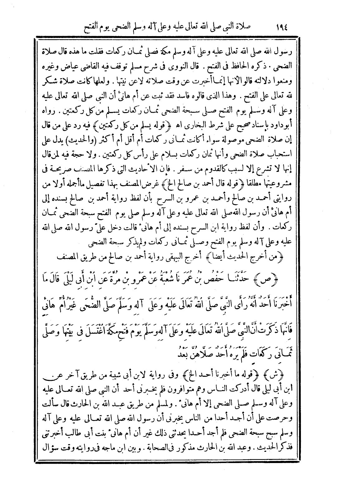 (ص) حَدَّثَنَا حَفْصُ بْنُ عُمَرَ نَا شُعْبَةُ عَنْ عَمْرِو بْنِ مُرَّةَ عَنِ ابْنِ أَبِي لَيْلَى قَالَ مَا أَنَا أَحَدٌ أَنَّهُ رَأَى النَّبِيَّ -صَلَّى الله تَعَالَى عَلَيْهِ وَعَلَى آلِهِ وَسَلَّمَ- صَلَّى الضُّحَى غَيْرَ أُمِّ هَانِئٍ فَإِنَّهَا ذَكَرَتْ أَنَّ النَّبِيَّ -صَلَّى الله تَعَالَى عَلَيْهِ وَعَلَى آلِهِ وَسَلَّمَ- يَوْمَ فَتْحِ مَكَّةَ اغْتَسَلَ فِي بَيْتِهَا وَصَلَّى ثَمَانِيَ رَكَعَاتٍ فَلَمْ يَرَهُ أَحَدٌ صَلاَّهُنَّ بَعْدُ.
