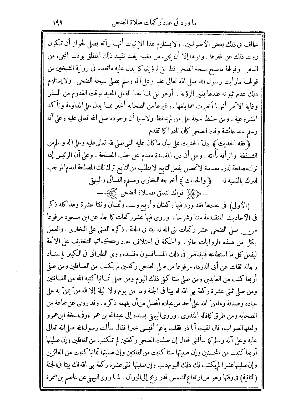 (الأولى) في عددها فقد ورد فيها ركعتان وأربع وست وثمان وثنتا عشرة وهذا كله ذكر في الأحاديث المتقدمة متنًا وشرحًا. وروى فيها عشر ركعات كما جاء عن ابن مسعود مرفوعًا من صلى الضحى عشر ركعات بني الله له ييتًا في الجنة. ذكره العيني علي البخاري. والعمل بكل من هذه الروايات جائز. والحكمة في اختلاف عدد ركعاتها التخفيف على الأمة ليفعل كل ما استطاعه فليتنافس في ذلك المتنافسون "فقد" روى الطبراني في الكبير بإسناد رجاله ثقات عن أبي الدرداء مرفوعًا من صلى الضحى ركعتين لم يكتب من الغافلين ومن صلى أربعًا كتب من العابدين ومن صلى ستًا كفي ذلك اليوم ومن صلى ثمانيًا كتبه الله من القانتين ومن صلى ثنتى عشرة ركعة بني الله له بيتًا في الجنة وما من يوم ولا ليلة إلا لله منّ يمنّ به على عبادة وصدقة وما منّ الله على أحد من عبادة أفضل من أن يلهمه ذكره. وقد روى عن جماعة من الصحابة ومن طرق كما قاله المنذري. وروى البيهقي بسنده إلى عبد الله بن عمر "وفي نسخة ابن عمرو ولعلها الصواب" قال لقيت أبا ذر فقلت يا عمّ أقبسني خبرًا فقال سألت رسول الله صلى الله تعالى عليه وعلى آله وسلم كما سألتني فقال إن صليت الضحى ركعتين لم تكتب من الغافلين وإن صليتها أربعًا كتبت من المحسنين وإن صليتها ستًا كتبت من القانتين وإن صليتها ثمانيًا كتبت من الفائزين وإن صليتها عشرًا لم يكتب لك ذلك اليوم ذنب وإن صليتها ثنتي عشرة ركعة بنى الله لك بيتًا في الجنة