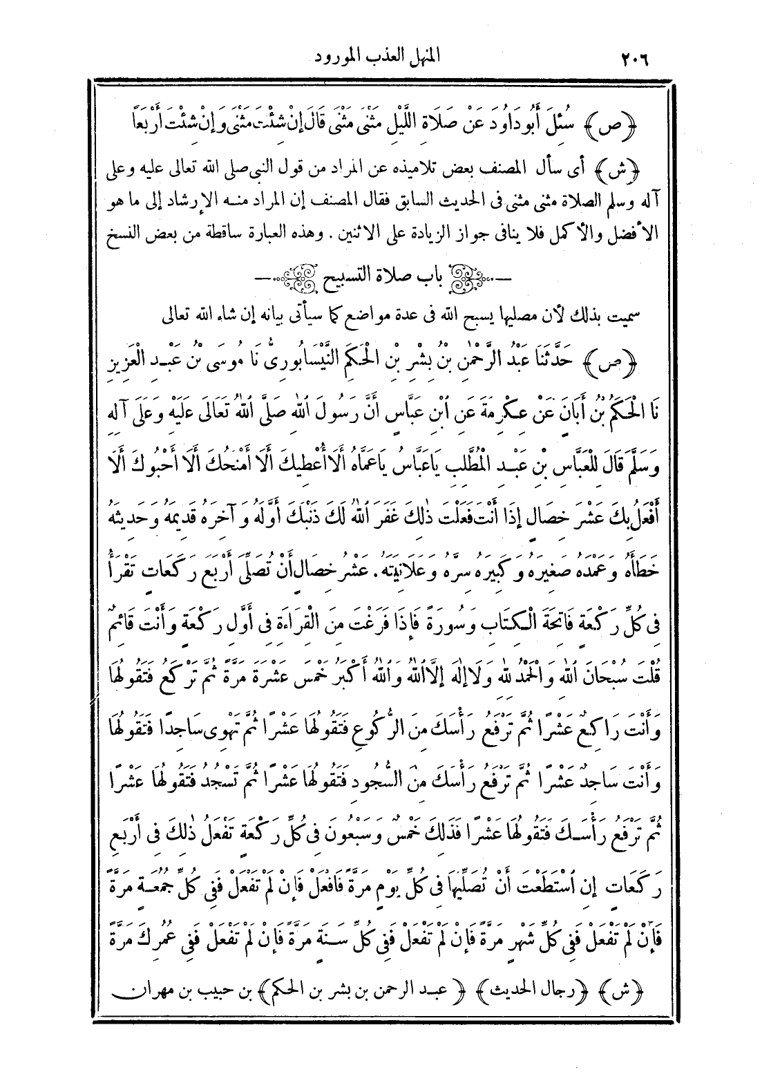 (ص) حَدَّثَنَا عَبْدُ الرَّحْمَنِ بْنُ بِشْرِ بْنِ الْحَكَمِ النَّيْسَابُورِيُّ نَا مُوسَى بْنُ عَبْدِ الْعَزِيزِ نَا الْحَكَمُ بْنُ أَبَانَ عَنْ عِكْرِمَةَ عَنِ ابْنِ عَبَّاسٍ أَنَّ رَسُولَ اللَّهِ -صَلَّى الله تَعَالَى عَلَيْهِ وَعَلَى آلِهِ وَسَلَّمَ- قَالَ لِلْعَبَّاسِ بْنِ عَبْدِ الْمُطَّلِبِ "يَا عَبَّاسُ يَا عَمَّاهُ أَلاَ أُعْطِيكَ أَلاَ أَمْنَحُكَ أَلاَ أَحْبُوكَ أَلاَ أَفْعَلُ بِكَ عَشْرَ خِصَالٍ إِذَا أَنْتَ فَعَلْتَ ذَلِكَ غَفَرَ اللَّهُ لَكَ ذَنْبَكَ أَوَّلَهُ وَآخِرَهُ قَدِيمَهُ وَحَدِيثَهُ خَطَأَهُ وَعَمْدَهُ صَغِيرَهُ وَكَبِيرَهُ سِرَّهُ وَعَلاَنِيَتَهُ عَشْرَ خِصَالٍ أَنْ تُصَلِّيَ أَرْبَعَ رَكَعَاتٍ تَقْرَأُ فِي كُلِّ رَكْعَةٍ فَاتِحَةَ الْكِتَابِ وَسُورَةً فَإِذَا فَرَغْتَ مِنَ الْقِرَاءَةِ فِي أَوَّلِ رَكْعَةٍ وَأَنْتَ قَائِمٌ قُلْتَ سُبْحَانَ اللَّهِ وَالْحَمْدُ لِلَّهِ وَلاَ إِلَهَ إِلاَّ اللَّهُ وَاللَّهُ أَكْبَرُ خَمْسَ عَشْرَةَ مَرَّةً ثُمَّ تَرْكَعُ فَتَقُولُهَا وَأَنْتَ رَاكِعٌ عَشْرًا ثُمَّ تَرْفَعُ رَأْسَكَ مِنَ الرُّكُوعِ فَتَقُولُهَا عَشْرًا ثُمَّ تَهْوِى سَاجِدًا فَتَقُولُهَا وَأَنْتَ سَاجِدٌ عَشْرًا ثُمَّ تَرْفَعُ رَأْسَكَ مِنَ السُّجُودِ فَتَقُولُهَا عَشْرًا ثُمَّ تَسْجُدُ فَتَقُولُهَا عَشْرًا ثُمَّ تَرْفَعُ رَأْسَكَ فَتَقُولُهَا عَشْرًا فَذَلِكَ خَمْسٌ وَسَبْعُونَ فِي كُلِّ رَكْعَةٍ تَفْعَلُ ذَلِكَ فِي أَرْبَعِ رَكَعَاتٍ إِنِ اسْتَطَعْتَ أَنْ تُصَلِّيَهَا فِي كُلِّ يَوْمٍ مَرَّةً فَافْعَلْ فَإِنْ لَمْ تَفْعَلْ فَفِى كُلِّ جُمُعَةٍ مَرَّةً فَإِنْ لَمْ تَفْعَلْ فَفِى كُلِّ شَهْرٍ مَرَّةً فَإِنْ لَمْ تَفْعَلْ فَفِى كُلِّ سَنَةٍ مَرَّةً فَإِنْ لَمْ تَفْعَلْ فَفِى عُمُرِكَ مَرَّةً".