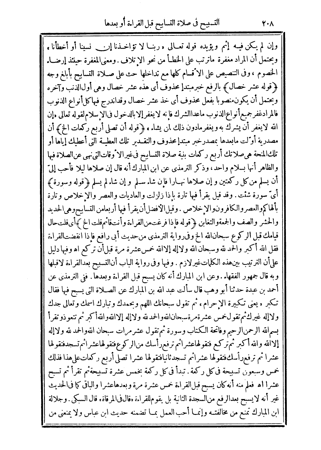 وعن ابن المبارك أنه كان يسبح قبل القراءة وبعدها. ففي الترمذي عن أحمد بن عبدة حدثنا أبو وهب قال سألت عبد الله بن المبارك عن الصلاة التي يسبح فيها فقال تكبر "يعني تكبيرة الإحرام" ثم تقول سبحانك اللهم وبحمدك وتبارك اسمك وتعالى جدك ولا إله غيرك ثم تقول خمس عشرة مرة سبحان الله والحمد لله ولا إله إلا الله والله أكبر ثم تتعوذ وتقرأ بِسْمِ اللَّهِ الرَّحْمَنِ الرَّحِيمِ وفاتحة الكتاب وسورة ثم تقول عشر مرات سبحان الله والحمد لله ولا إله إلا الله والله أكبر ثم تركع فتقولها عشرًا ثم ترفع رأسك من الركوع فتقولها عشرًا ثم تسجد فتقولها عشرًا ثم ترفع رأسك فتقولها عشرًا ثم تسجد ثانيًا فتقولها عشرًا تصلي أربع ركعات على هذا فذلك خمس وسبعون تسبيحة في كل ركعة. تبدأ في كل ركعة بخمس عشرة تسبيحة ثم تقرأ ثم تسبح عشرًا اهـ