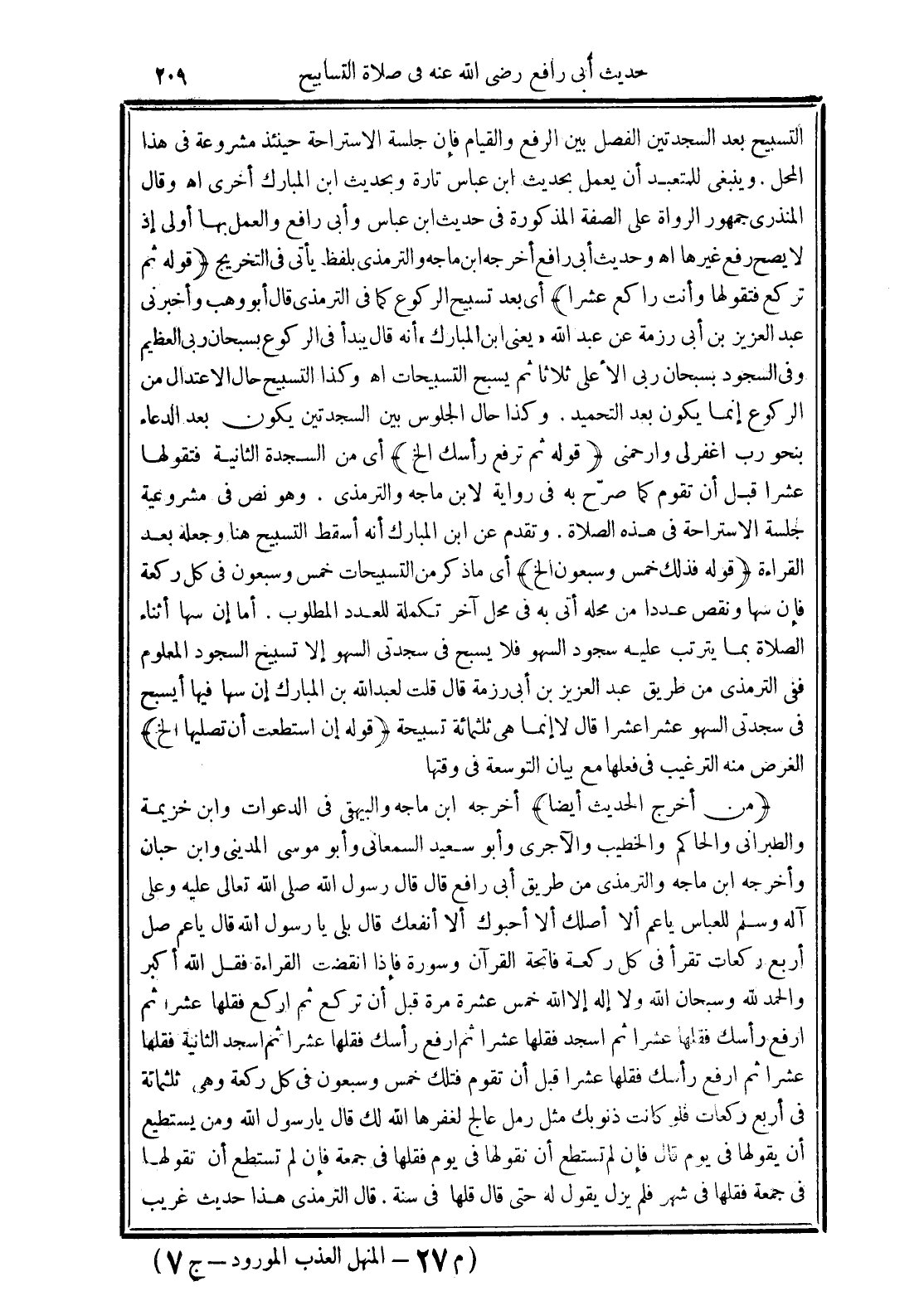 (من أخرج الحديث أيضًا) أخرجه ابن ماجه والبيهقي في الدعوات وابن خزيمة والطبراني والحاكم والخطيب والآجرى وأبو سعيد السمعاني وأبو موسى المديني وابن حبان وأخرجه ابن ماجه والترمذي من طريق أبي رافع قال قال رسول الله صلى الله تعالى عليه وعلى آله وسلم للعباس يا عم ألا أصلك ألا أحبوك ألا أنفعك قال بلى يا رسول الله قال يا عم صل أربع ركعات تقرأ في كل ركعة فاتحة القرآن وسورة فإذا انقضت القراءة فقل الله أكبر والحمد لله وسبحان الله ولا إله إلا الله خمس عشرة مرة قبل أن تركع ثم اركع فقلها عشرًا ثم ارفع رأسك فقلها عشرًا ثم اسجد فقلها عشرًا تم ارفع رأسك فقلها عشرًا ثم اسجد الثانية فقلها عشرًا ثم ارفع رأسك فقلها عشرًا قبل أن تقوم فتلك خمس وسبعون في كل ركعة وهي ثلثمائة في أربع ركعات فلو كانت ذنوبك مثل رمل عالج لغفرها الله لك قال يا رسول الله ومن يستطيع أن يقولها في يوم قال فإن لم تستطع أن تقولها في يوم فقلها في جمعة فإن لم تستطع أن تقولها في جمعة فقلها في شهر فلم يزل يقول له حتى قال قلها في سنة. قال الترمذي هذا حديث غريب