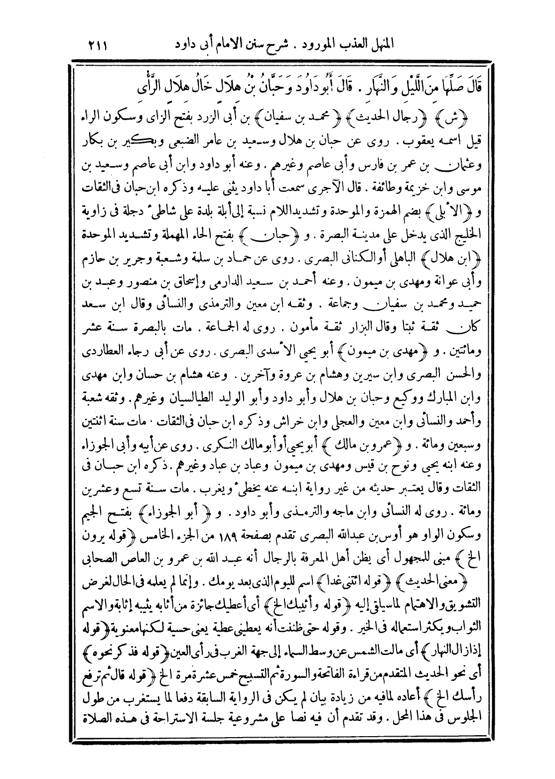 (ش) (رجال الحديث) (محمد بن سفيان) بن أبي الزرد بفتح الزاي وسكون الراء قيل اسمه يعقوب. روي عن حبان بن هلال وسعيد بن عامر الضبعي وبكير بن بكار وعثمان بن عمر بن فارس وأبي عاصم وغيرهم. وعنه أبو داود وابن أبي عاصم وسعيد بن موسي وابن خزيمة وطائفة. قال الآجري سمعت أبا داود يثني عليه وذكره بن حبان في الثقات و (الأبلي) بضم الهمزة والموحدة وتشديد اللام نسبة إلي أبلة بلدة علي شاطئ دجلة في زاوية الخليج الذي يدخل علي مدينة البصرة. و (حبان) بفتح الحاء المهملة وتشديد الموحدة (ابن هلال) الباهلي أو الكناني البصري. وعنه أحمد بن سعيد الدارمي وإسحاق بن منصور وعبد بن حميد ومحمد ابن سفيان وجماعة. وثقة بن معين ووالترمذي والنسائي وقال ابن سعد وكان ثقة ثبتًا وقال البزار ثقة مأمون. روي له الجماعة. مات بالبصرة سنة عشر ومائتين. و (مهدي بن ميمون) أبو يحيي الأسدي البصري. روي عن أبي رجاء العطاردي والحسن البصري وابن سيرين وهشام بن عروة وآخرين. وعنه هشام بن حسن وابن مهدي وابن المبارك ووكيع وحبان بن هلال وأبو داود وأبو وليد الطيالسيان وغيرهم. وثقة شعبة وأحمد والنسائي وابن معين والعجلي وابن خراش وذكره بن حبان في الثقات. مات سنة اثنتين وسبعين ومائة. و (عمرو بن مالك) أبو يحيي أو أبو مالك النكري. روي عن أبيه وأبي الجوزاء وعنه ابنه يحيي ونوح بن قيس ومهدي بن ميمون وعباد بن عباد وغيرهم. ذكره بن حبان في الثقات وقال يعتبر حديثه من غير رواية ابنه يخطئ ويغرب. مات سنة تسع وعشرين ومائة. روي له النسائي وابن ماجة والترمذي وأبو داود. و (أبو الجوزاء) بفتح الجيم وسكون الواو هو أوس بن عبد الله البصري تقدم بصفحة 189 من الجزء الخامس