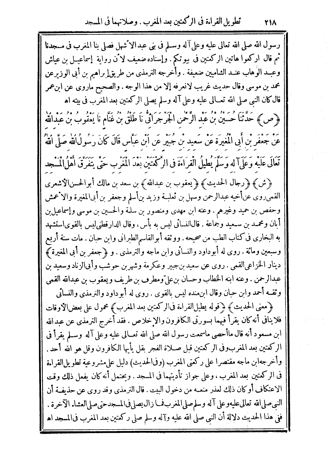 (ص) حَدَّثَنَا حُسَيْنُ بْنُ عَبْدِ الرَّحْمَنِ الْجَرْجَرَائِيُّ نَا طَلْقُ بْنُ غَنَّامٍ نَا يَعْقُوبُ بْنُ عَبْدِ اللَّهِ عَنْ جَعْفَرِ بْنِ أَبِي الْمُغِيرَةِ عَنْ سَعِيدِ بْنِ جُبَيْرٍ عَنِ ابْنِ عَبَّاسٍ قَالَ كَانَ رَسُولُ اللَّهِ -صَلَّى الله تَعَالَى عَلَيْهِ وَعَلَى آلِهِ وَسَلَّمَ- يُطِيلُ الْقِرَاءَةَ فِي الرَّكْعَتَيْنِ بَعْدَ الْمَغْرِبِ حَتَّى يَتَفَرَّقَ أَهْلُ الْمَسْجِدِ.