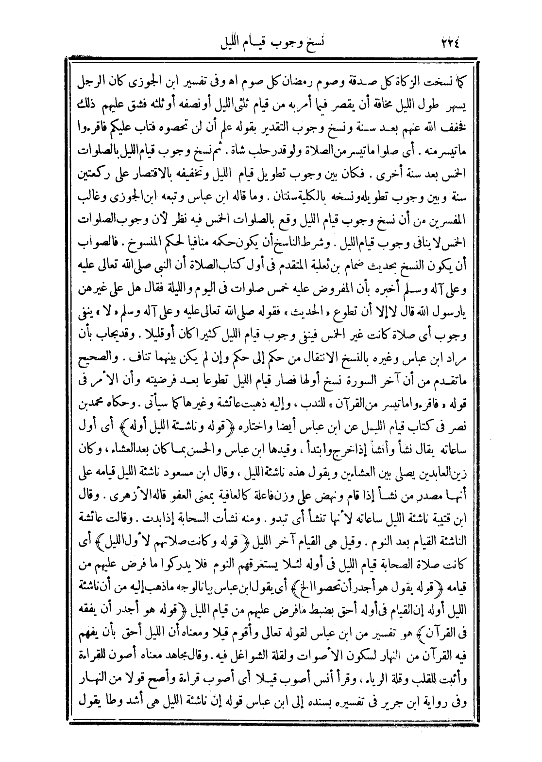 وما قاله ابن عباس وتبعه ابن الجرزي وغالب المفسرين من أن نسخ وجوب قيام الليل وقع بالصلوات الخمس فيه نظر لأن وجوب الصلوات الخمس لا ينافي وجوب قيام الليل. شرط الناسخ أن يكون حكمه منافيًا لحكم المنسوخ. فالصواب أن يكون النسخ بحديث ضمام بن ثعلبة المتقدم في أول كتاب ألصلاة أن النبي صلى الله تعالى عليه وعلى آله وسلم أخبره بأن المفروض عليه خمس صلوات في اليوم والليلة فقال هل على غيرهن يا رسول الله قال لا إلا أن تطوع "الحديث" فقوله صلى الله تعالى عليه وعلى آله وسلم "لا" ينفي وجوب أي صلاة كانت غير الخمس فينفي وجوب قيام الليل كثيرًا كان أو قليلًا. وقد يجاب بأن مراد ابن عباس وغيره بالنسخ الانتقال من حكم إلى حكم وإن لم يكن بينهما تناف.