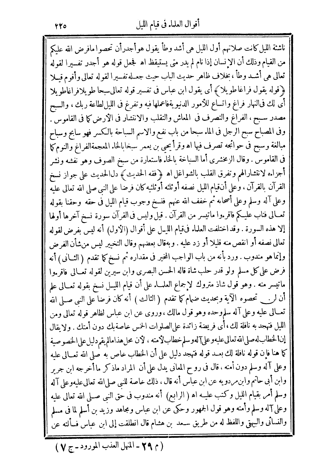 (الثاني) أنه فرض على كل مسلم ولو قدر حلب شاة قاله الحسن البصري وابن سيرين لقوله تعالى (فَاقْرَءُوا مَا تَيَسَّرَ مِنْهُ). وهو قول شاذ متروك لإجماع العلماء على أن قيام الليل نسخ بقوله تعالى (عَلِمَ أَنْ لَنْ تُحْصُوهُ) الآية وبحديث ضمام كما تقدم