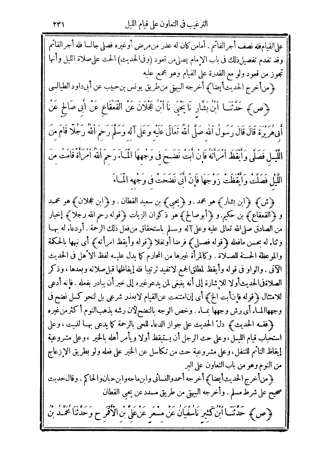 (ص) حَدَّثَنَا ابْنُ بَشَّارٍ نَا يَحْيَى نَا ابْنُ عَجْلاَنَ عَنِ الْقَعْقَاعِ عَنْ أَبِي صَالِحٍ عَنْ أَبِي هُرَيْرَةَ قَالَ قَالَ رَسُولُ اللَّهِ -صَلَّى الله تَعَالَى عَلَيْهِ وَعَلَى آلِهِ وَسَلَّمَ- "رَحِمَ اللَّهُ رَجُلًا قَامَ مِنَ اللَّيْلِ فَصَلَّى وَأَيْقَظَ امْرَأَتَهُ فَإِنْ أَبَتْ نَضَحَ فِي وَجْهِهَا الْمَاءَ رَحِمَ اللَّهُ امْرَأَةً قَامَتْ مِنَ اللَّيْلِ فَصَلَّتْ وَأَيْقَظَتْ زَوْجَهَا فَإِنْ أَبَى نَضَحَتْ فِي وَجْهِهِ الْمَاءَ".