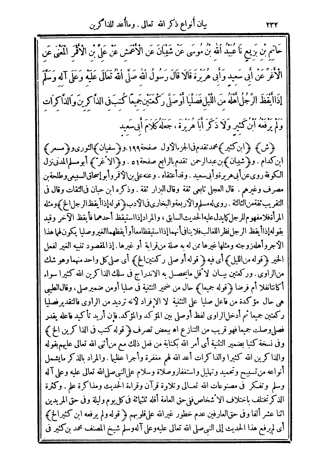 حَاتِمِ بْنِ بَزِيعٍ نَا عُبَيْدُ اللَّهِ بْنُ مُوسَى عَنْ شَيْبَانَ عَنِ الأَعْمَشِ عَنْ عَلِيِّ بْنِ الأَقْمَرِ -الْمَعْنَى- عَنِ الأَغَرِّ عَنْ أَبِي سَعِيدٍ وَأَبِي هُرَيْرَةَ قَالاَ قَالَ رَسُولُ اللَّهِ -صَلَّى الله تَعَالَى عَلَيْهِ وَعَلَى آلِهِ وَسَلَّمَ- "إِذَا أَيْقَظَ الرَّجُلُ أَهْلَهُ مِنَ اللَّيْلِ فَصَلَّيَا أَوْ صَلَّى رَكْعَتَيْنِ جَمِيعًا كُتِبَا فِي الذَّاكِرِينَ وَالذَّاكِرَاتِ". وَلَمْ يَرْفَعْهُ ابْنُ كَثِيرٍ وَلاَ ذَكَرَ أَبَا هُرَيْرَةَ جَعَلَهُ كَلاَمَ أَبِي سَعِيدٍ.